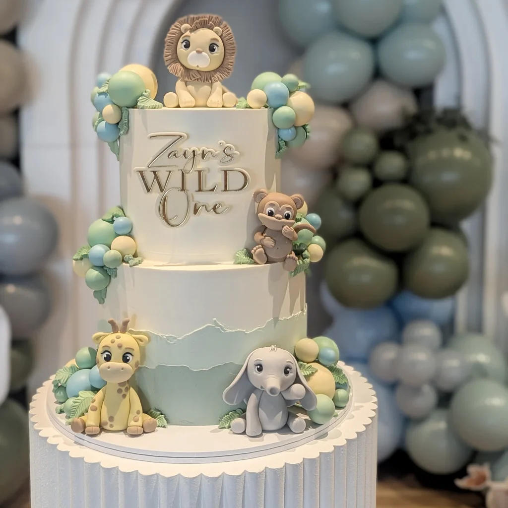 This safari-themed cake is truly adventurous for a first birthday cake. Adorable fondant animals, including a lion, monkey, giraffe, and elephant, bring the wild to life. Gentle green and blue tones create a playful jungle atmosphere.