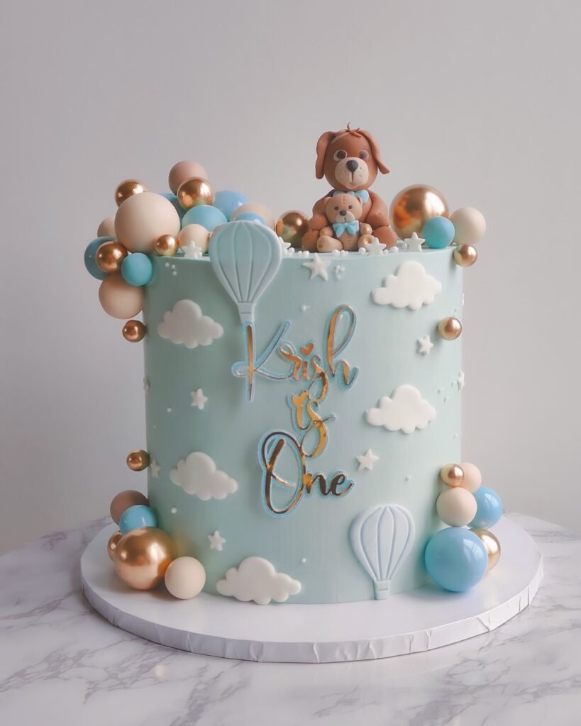 Delicate blue and cream-colored balloons rise above the cake, adding a cheerful touch. The banner on top proudly says “ONE,” completing the celebratory message. This cake is a charming choice for a big milestone.
