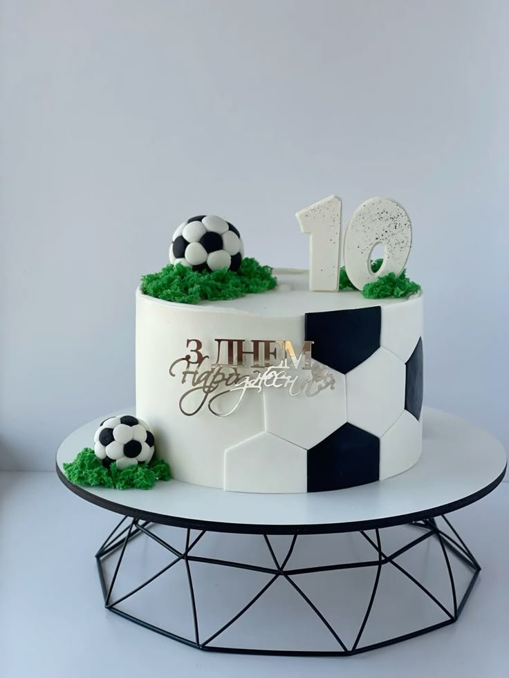 This clean and modern cake scores big on style. One half has a soccer ball design, with a large number ten topper for a special milestone birthday.