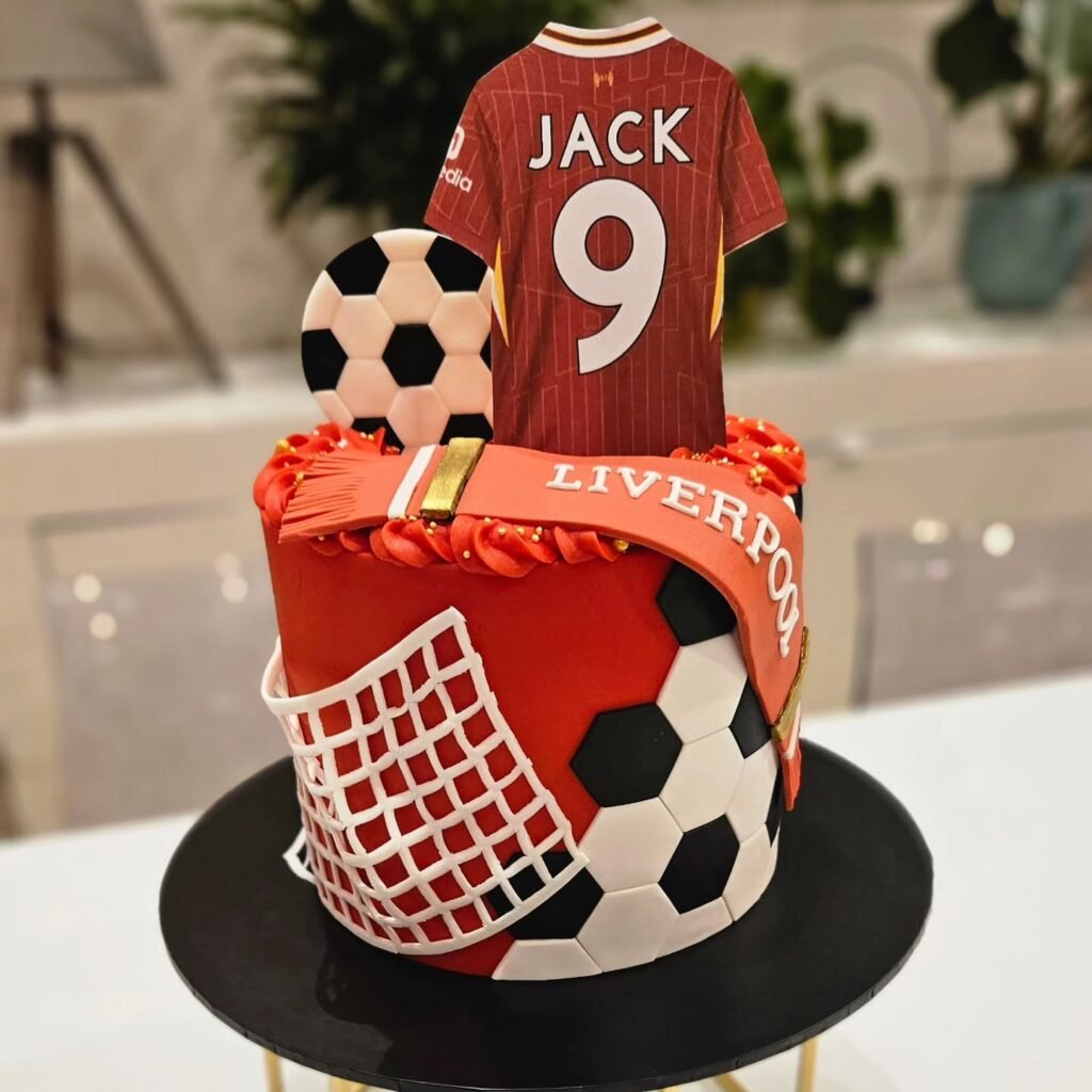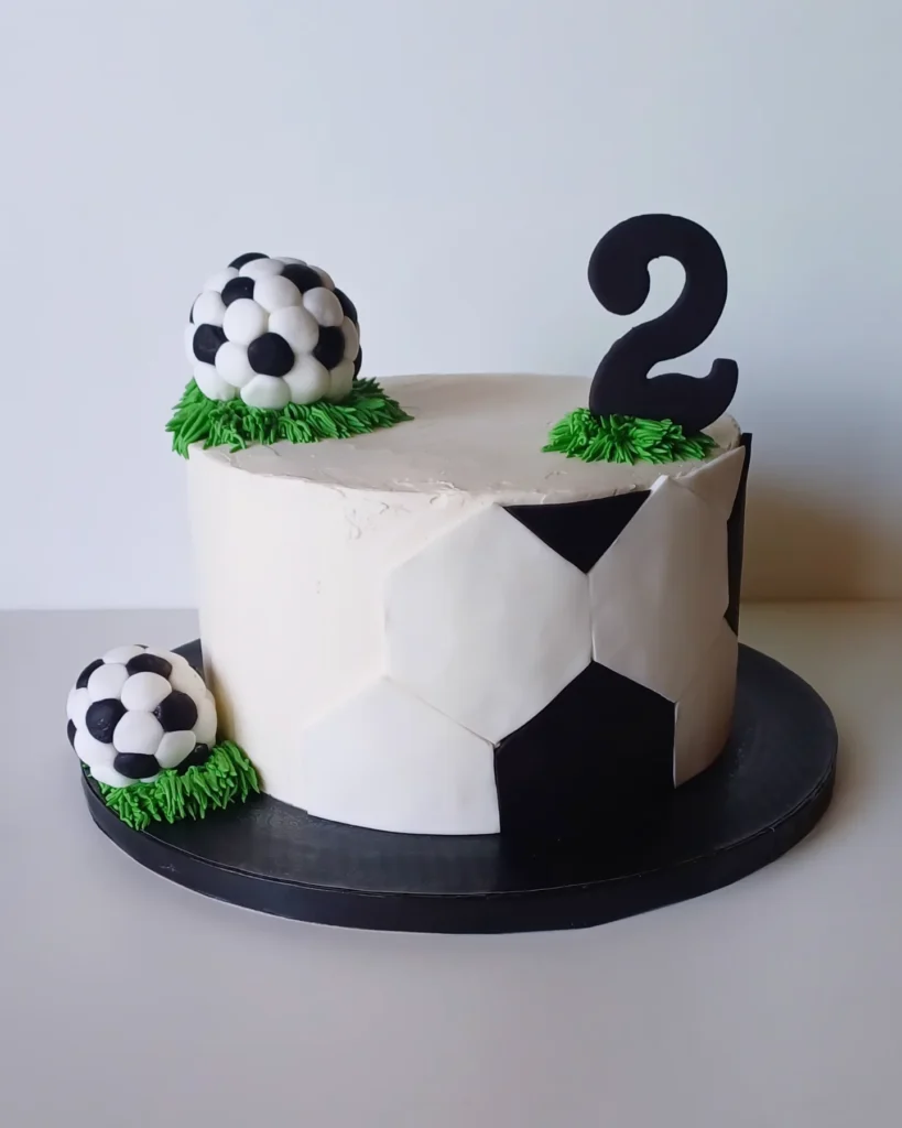 The black and white hexagons on the side complete the theme. It’s a fun and memorable cake for a young fan’s special celebration.