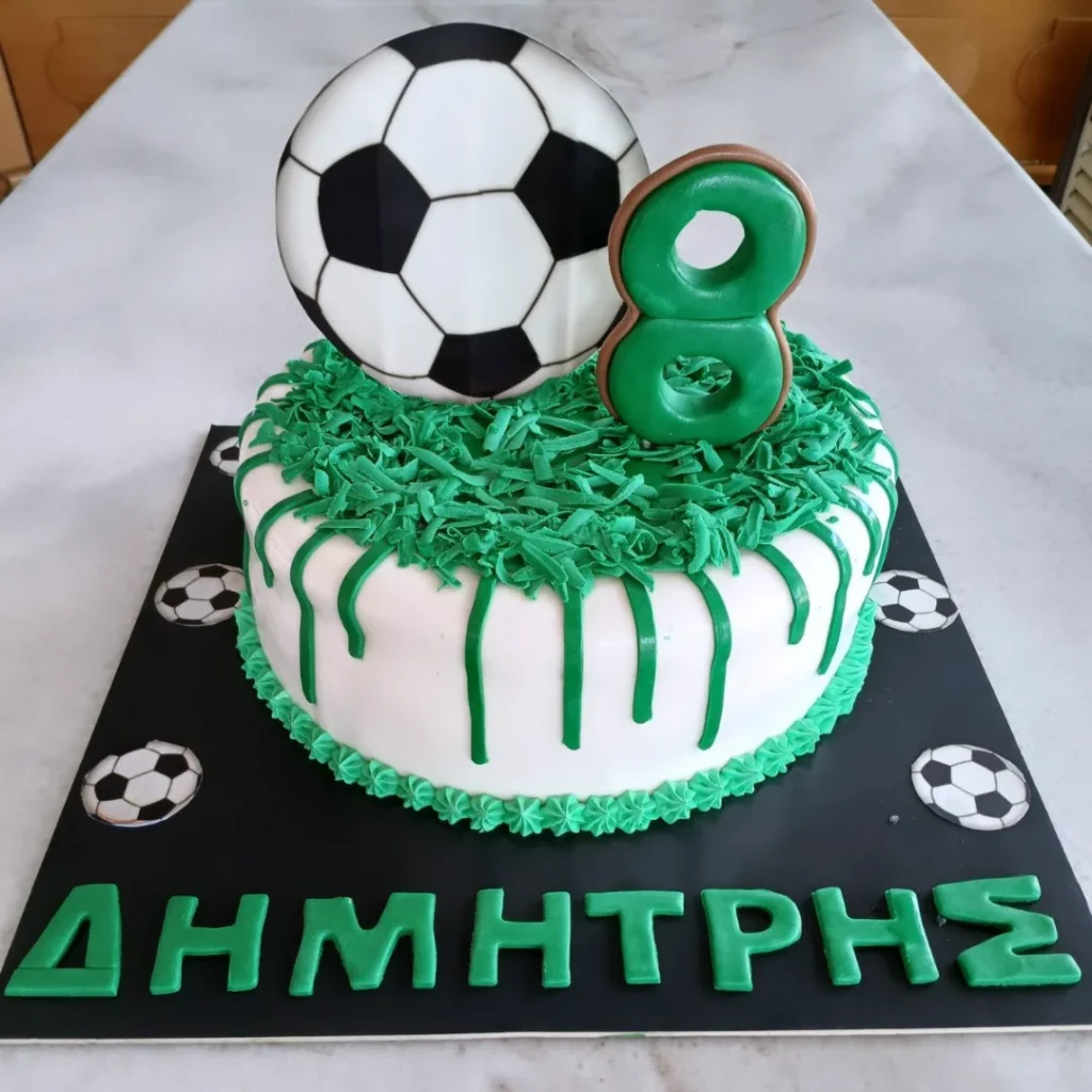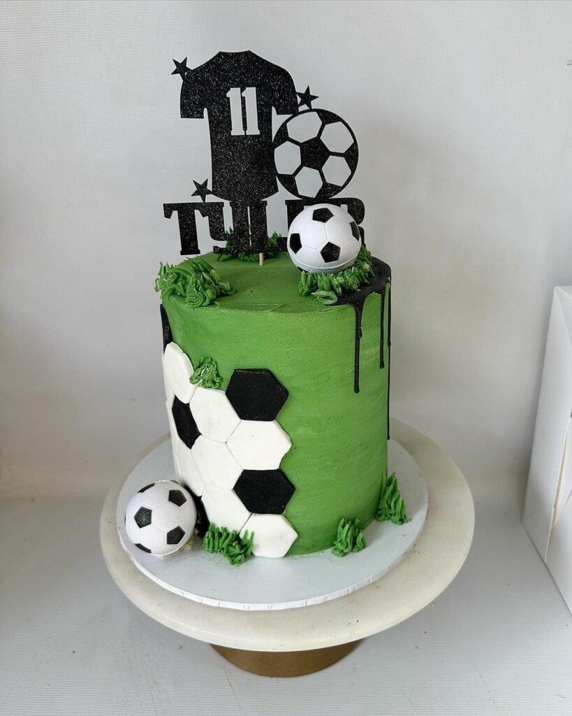The entire cake sits on a black board decorated with smaller soccer balls and a personalized name in green lettering. It’s a perfect way to score a sweet victory.