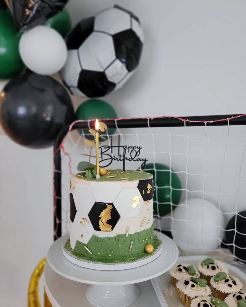 This cake is a stylish centerpiece for any celebration. It looks great with matching cupcakes and a fun soccer theme party, making it a true winner.