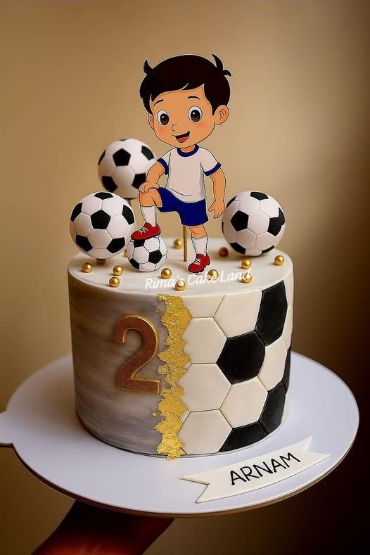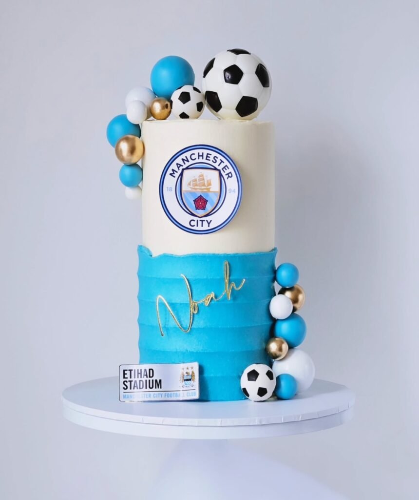 This personalized cake is a true fan’s dream. Its sides feature bold soccer ball hexagons and a custom name in striking gold lettering, making it a standout.