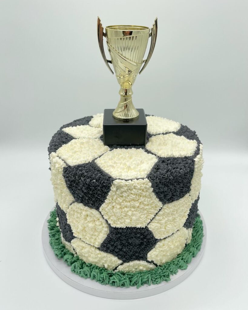 This winning cake is a masterpiece for any champion. It’s decorated with textured black and white icing, just like a classic soccer ball, creating a great look.
