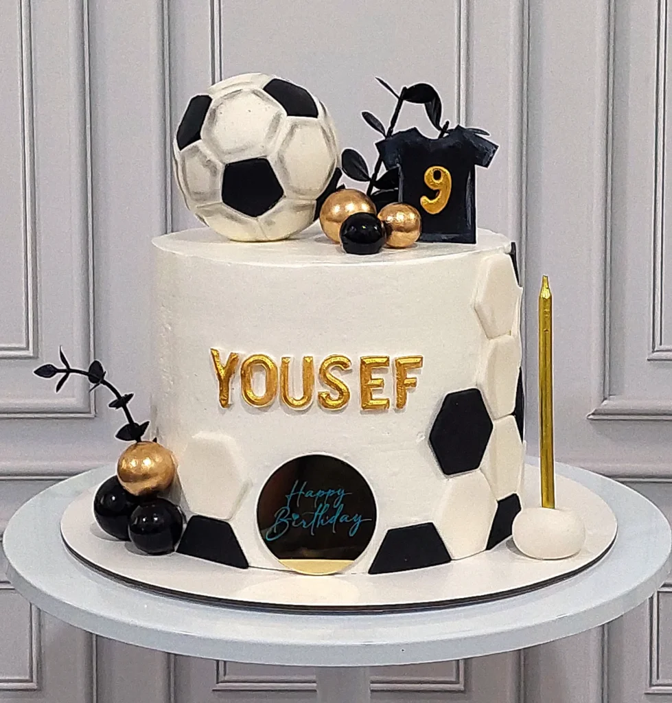 A sleek black hexagon showcases a gold silhouette of a player, ready for a kick. This detail adds a dynamic and personalized touch that truly makes the cake stand out.