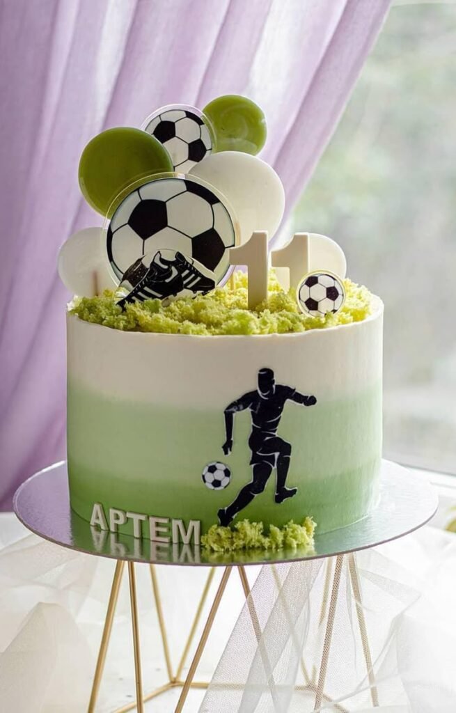 Fresh greenery gives the cake a unique and sophisticated feel. It’s a stylish choice for any young player’s special day.