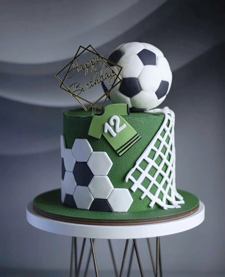 This clever football birthday cake combines two styles. The top is a green field, while the sides feature a modern soccer ball design with elegant gold leaf accents.