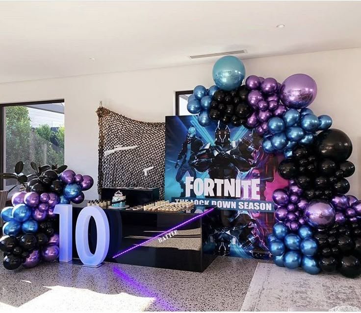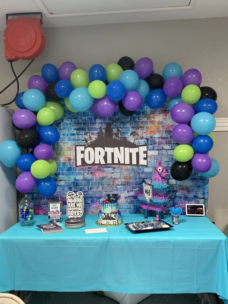 This party setup is an exciting example of dynamic Fortnite birthday party ideas. The backdrop features balloon arches in green, purple, blue, and black, which add a lively, festive touch.