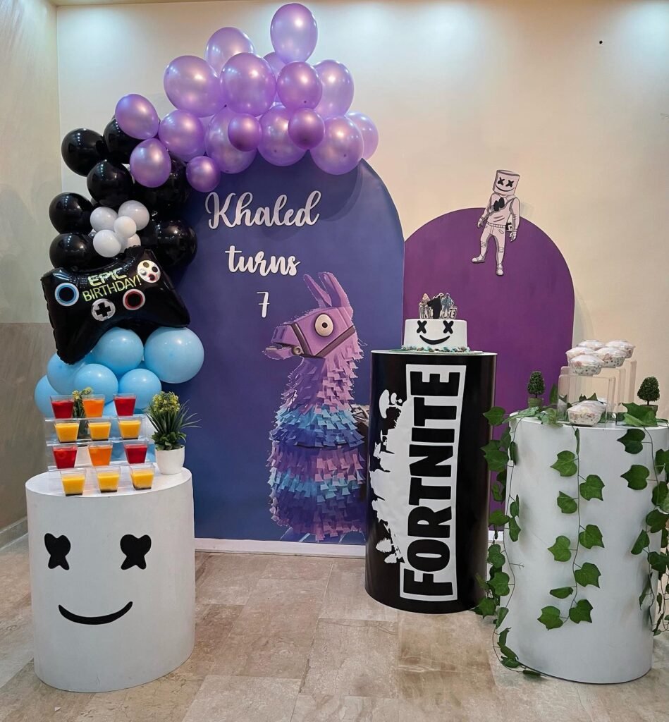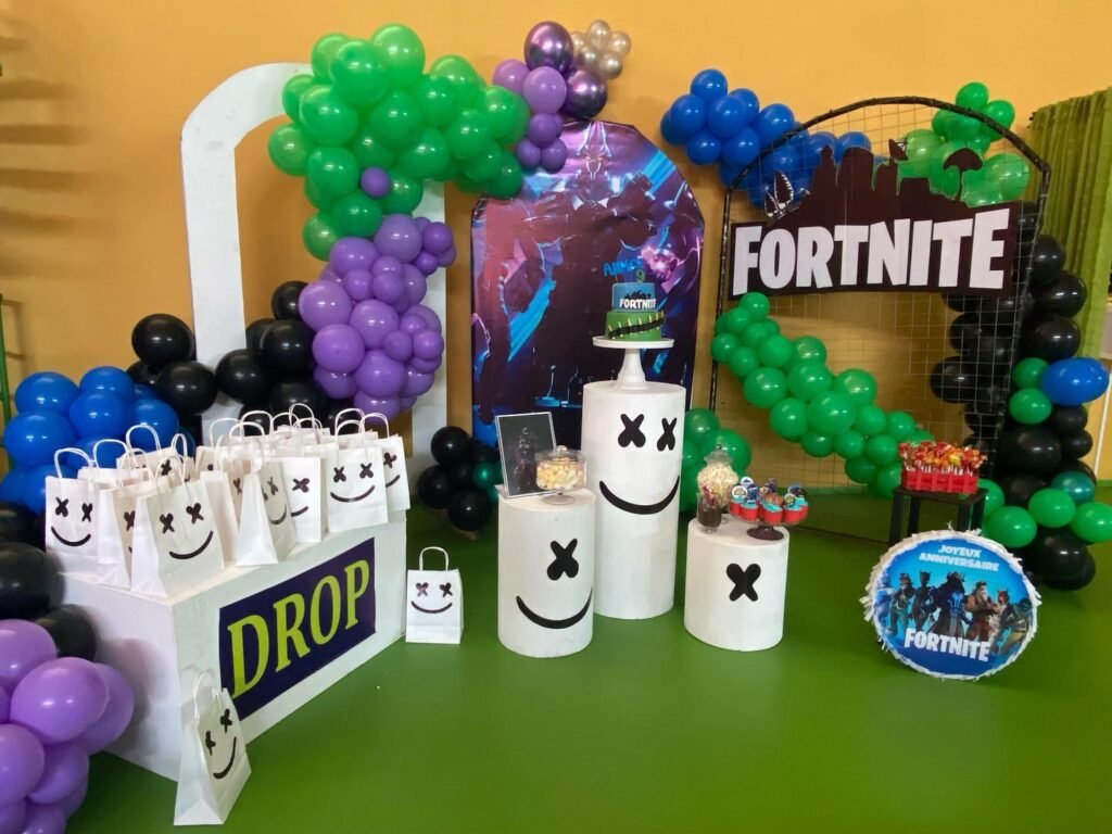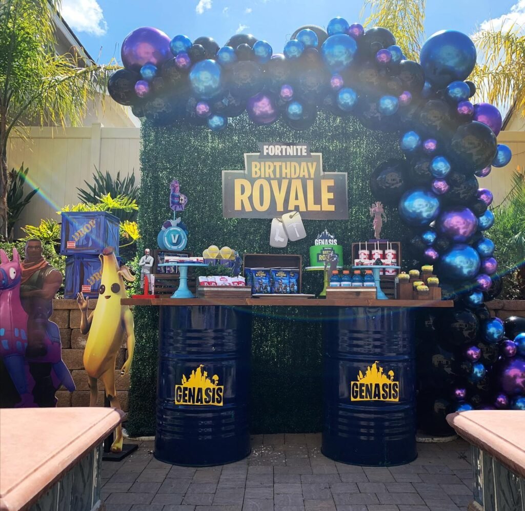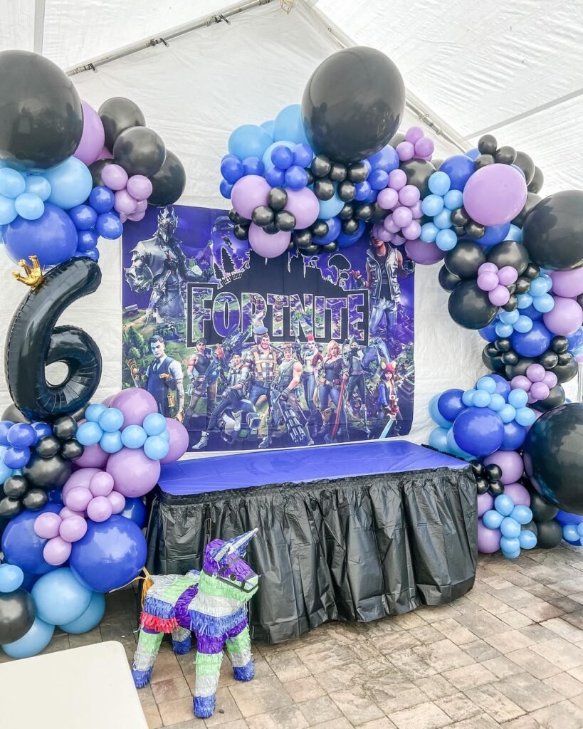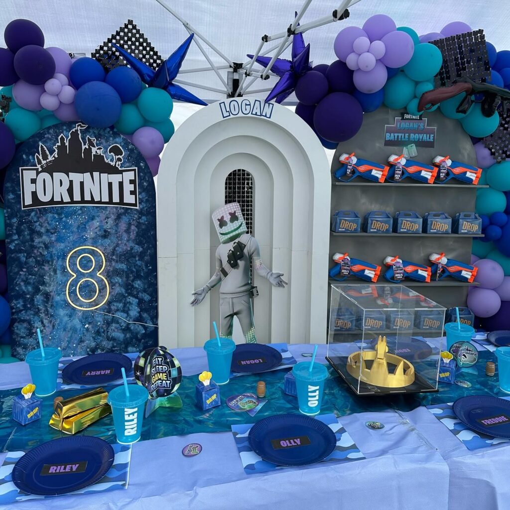 A balloon arch in blue, purple, and white frames the entire scene. It creates an immersive atmosphere. Every detail is a nod to the game, making the party a true battle royale of fun.