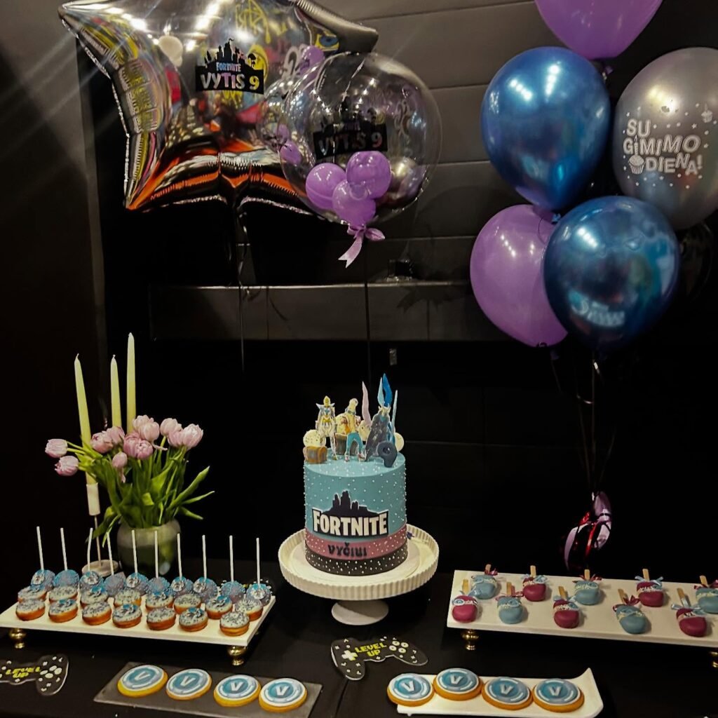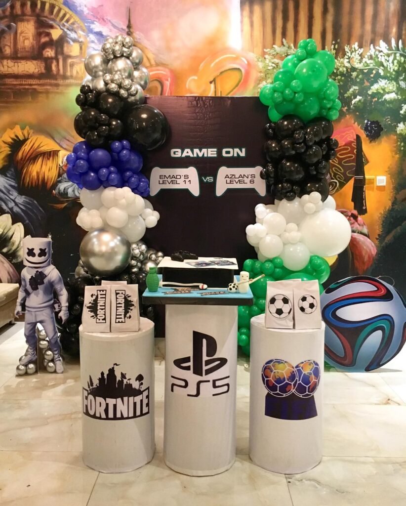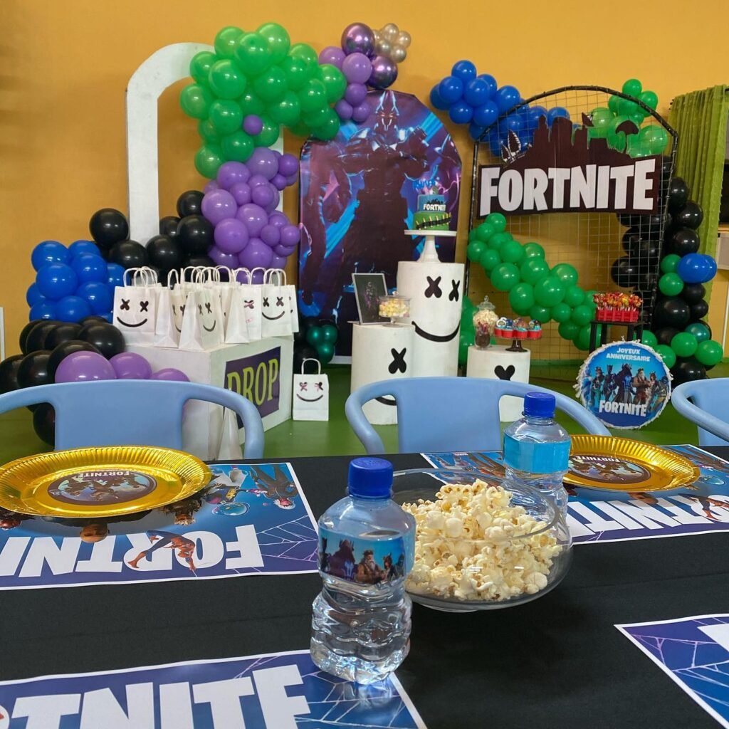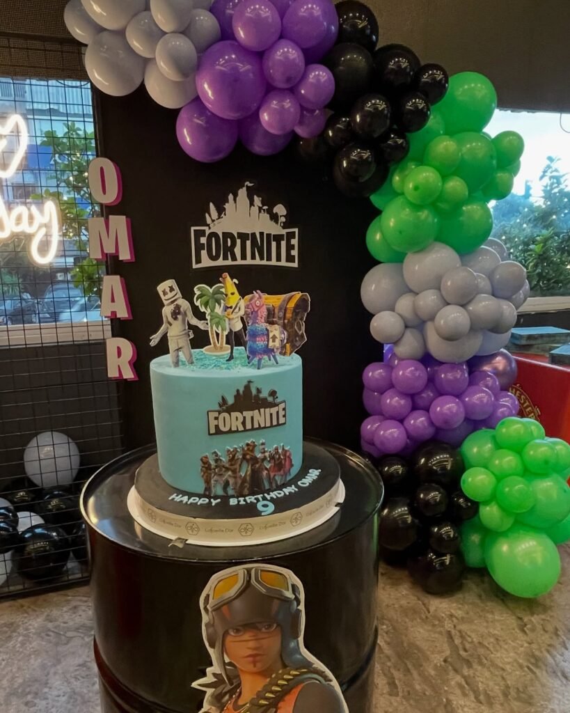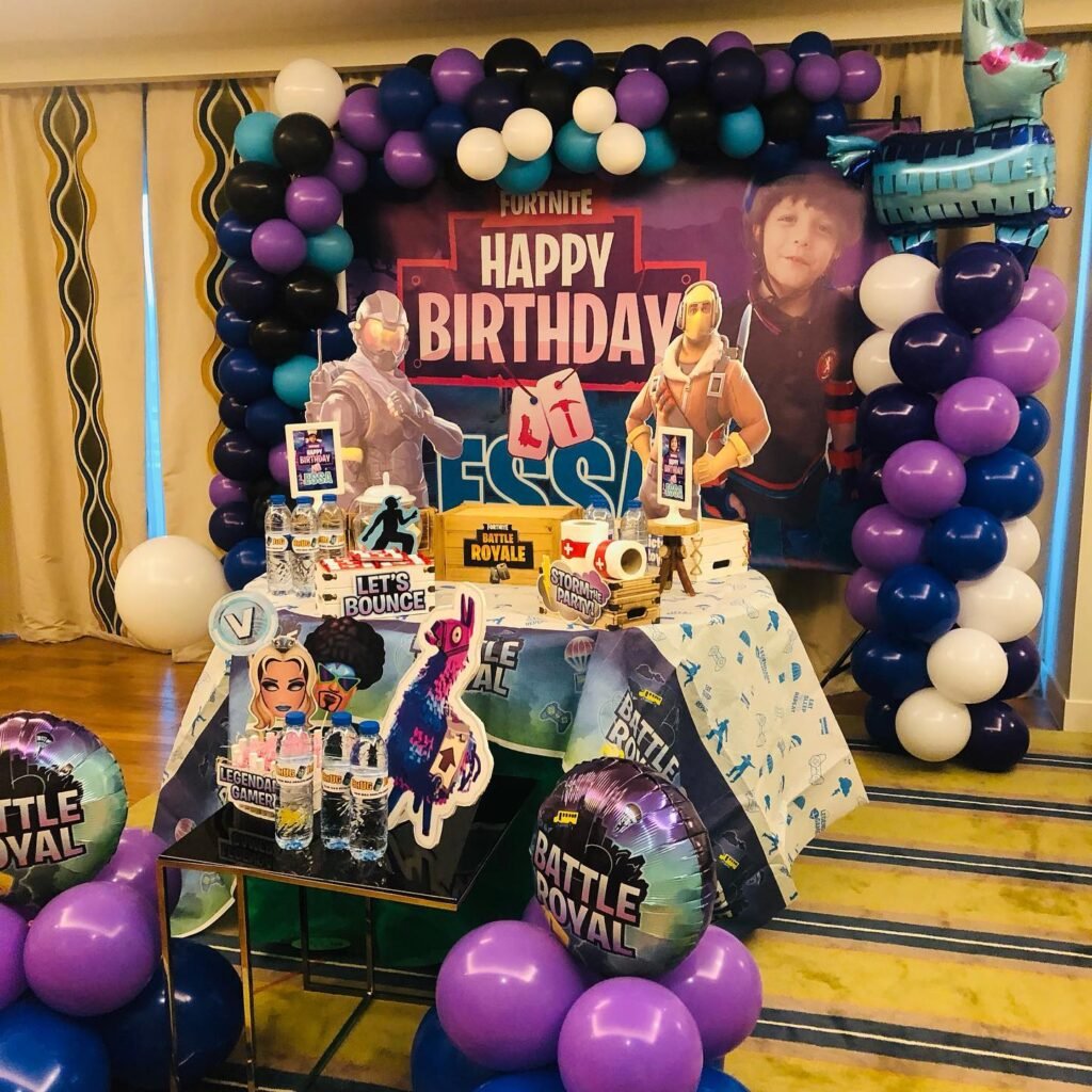 A balloon arch in blue, purple, and white frames the entire scene. It creates an immersive atmosphere. Every detail is a nod to the game, making the party a true battle royale of fun.