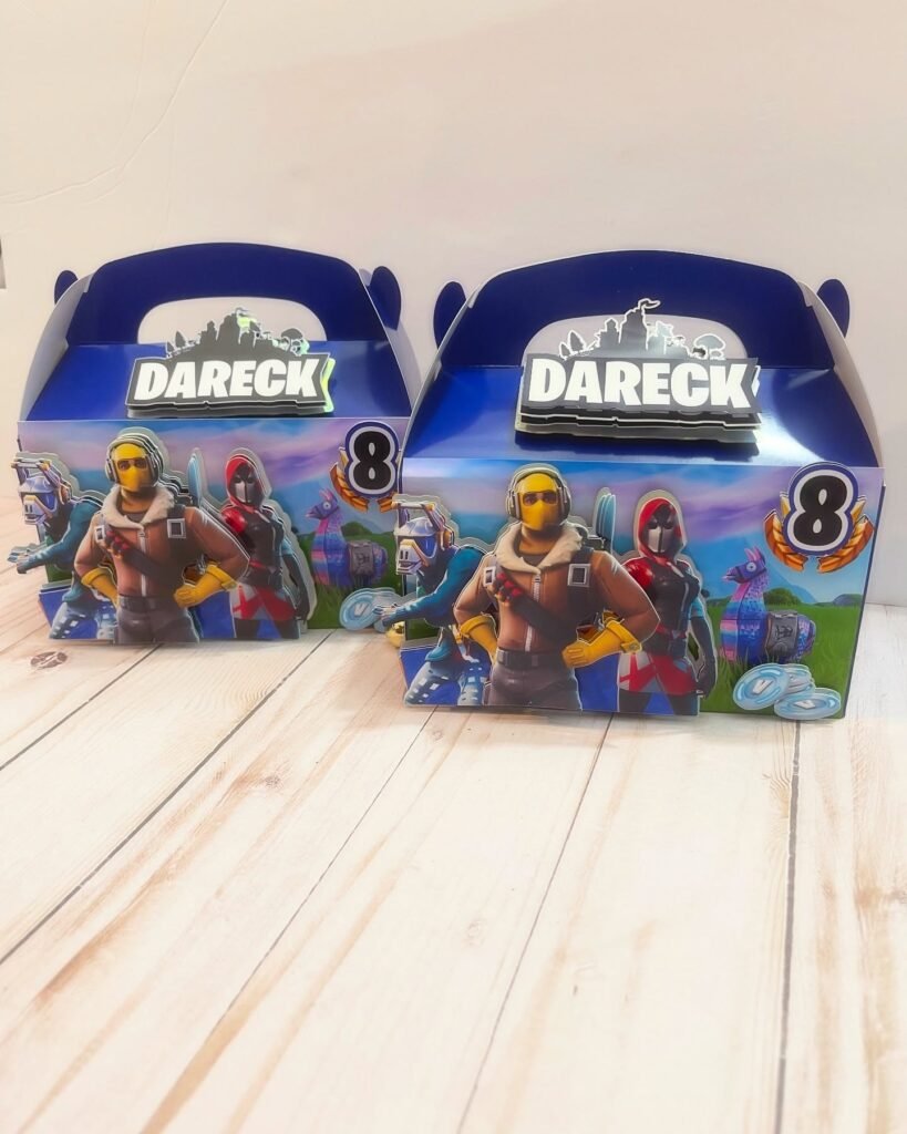 These custom favor boxes are a fun way to send guests home with a party prize. They are a great example of Fortnite birthday party ideas that are both practical and exciting.