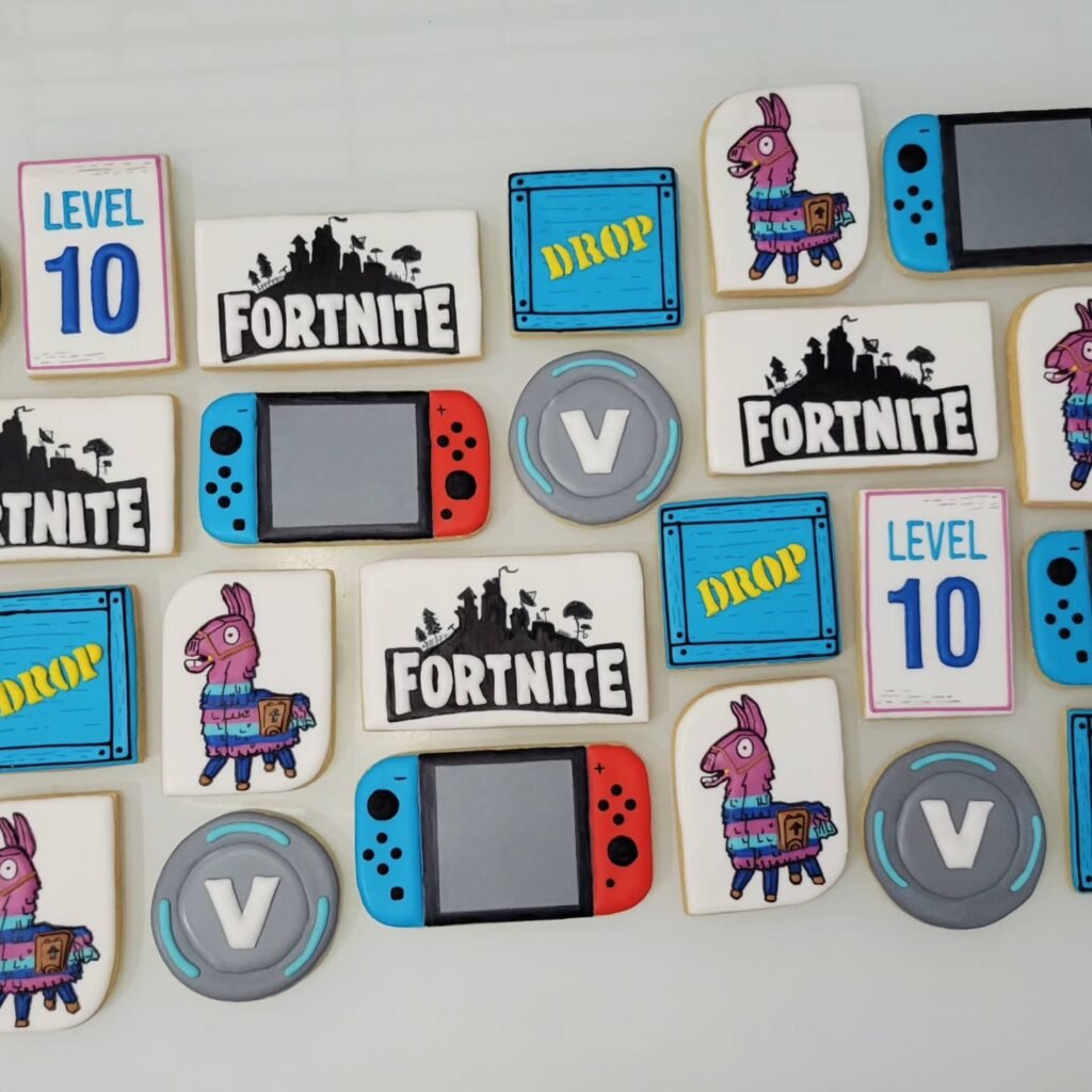 The designs include the Fortnite logo, Loot Llamas, and drop crates. A “Level 10” cookie and a V-Bucks token add a personalized and thematic touch to the sweet treats.