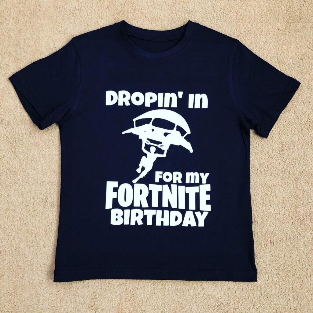 The words “Dropin’ In For My Fortnite Birthday” are a playful nod to the game’s opening sequence. The simple design is stylish and comfortable, suitable for any young gamer.