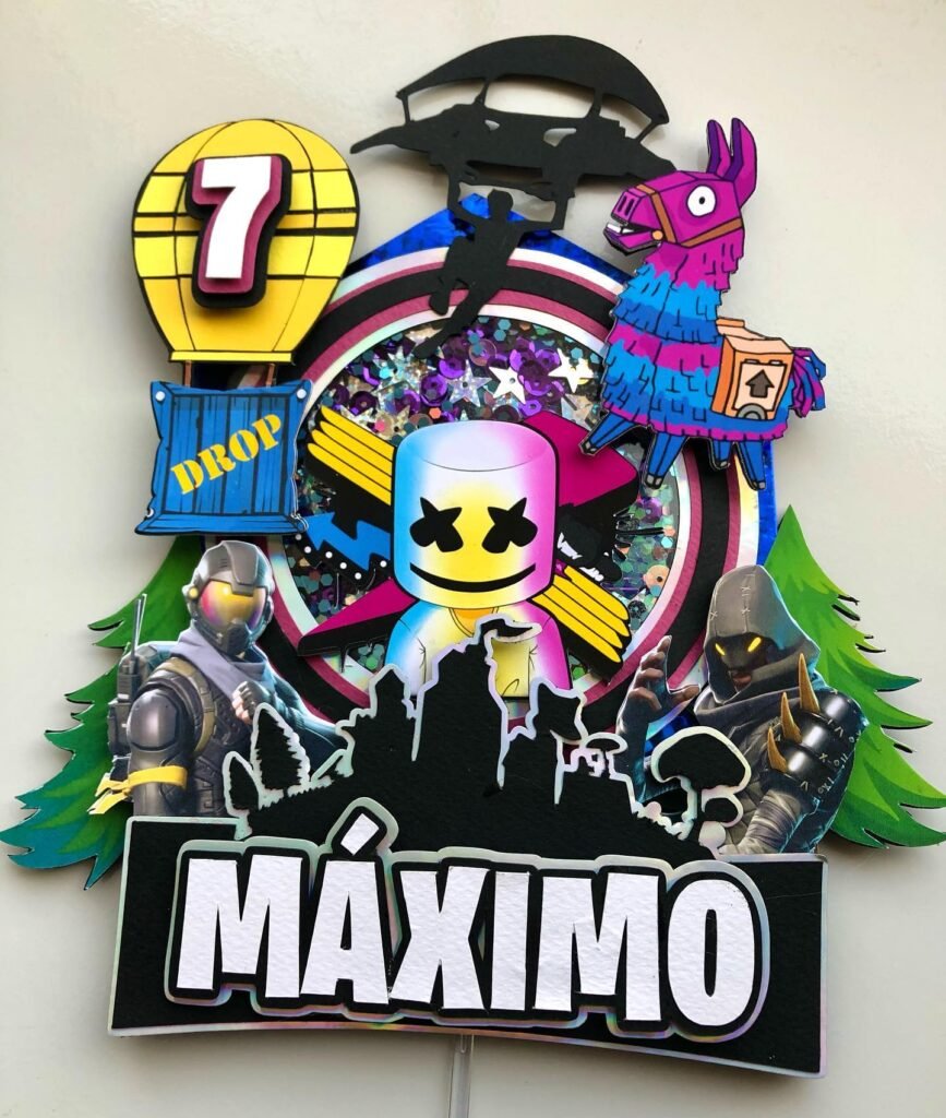 This custom cake topper is a brilliant example of creative Fortnite birthday party ideas. It features a colorful Marshmello, a Loot Llama, and two popular character skins.
