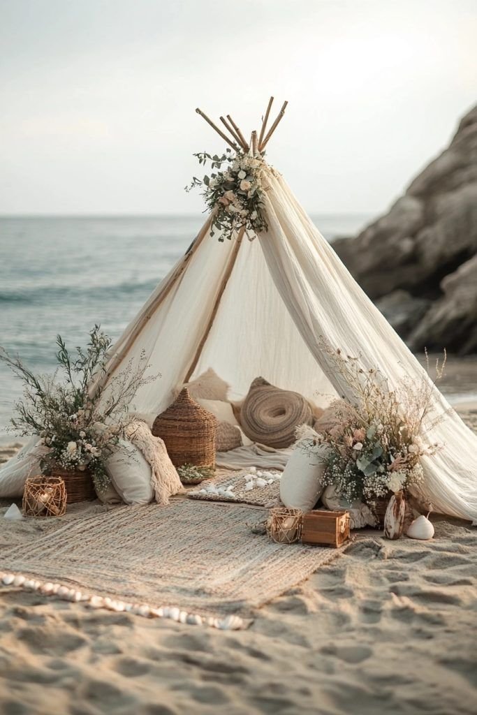 This stunning setup brings a touch of bohemian luxury to the shoreline. A simple tipi is adorned with delicate floral arrangements and dried grasses. It creates a secluded, intimate space right on the beach.