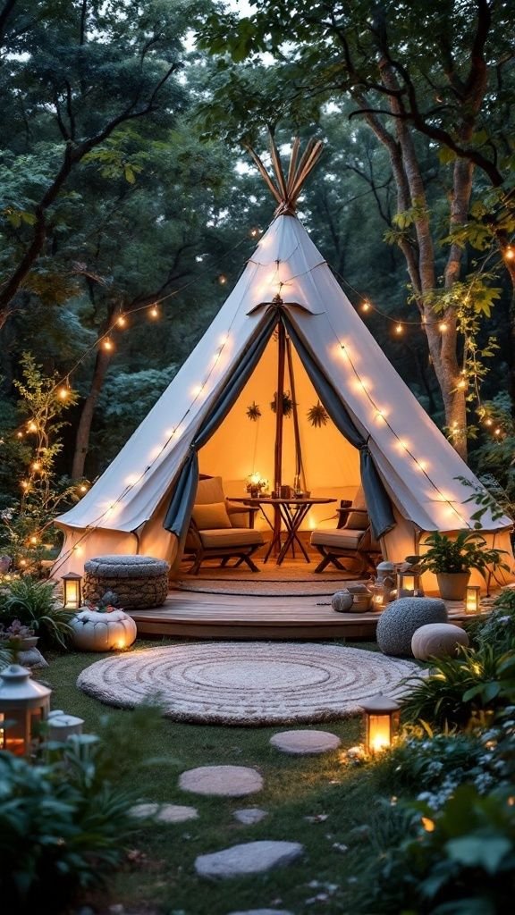A small table and two chairs offer an intimate dining space inside. Lanterns and soft cushions are scattered around the base of the tent, creating a magical, inviting atmosphere. This setup feels like a true hideaway from the world.