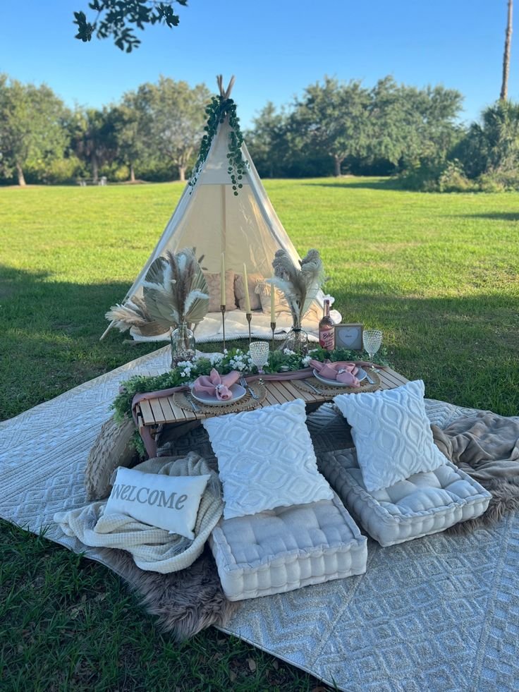 The “welcome” pillow adds a warm, inviting touch. This glamping setup provides a stylish and comfortable way to have a memorable picnic. It’s a beautifully styled outdoor experience.