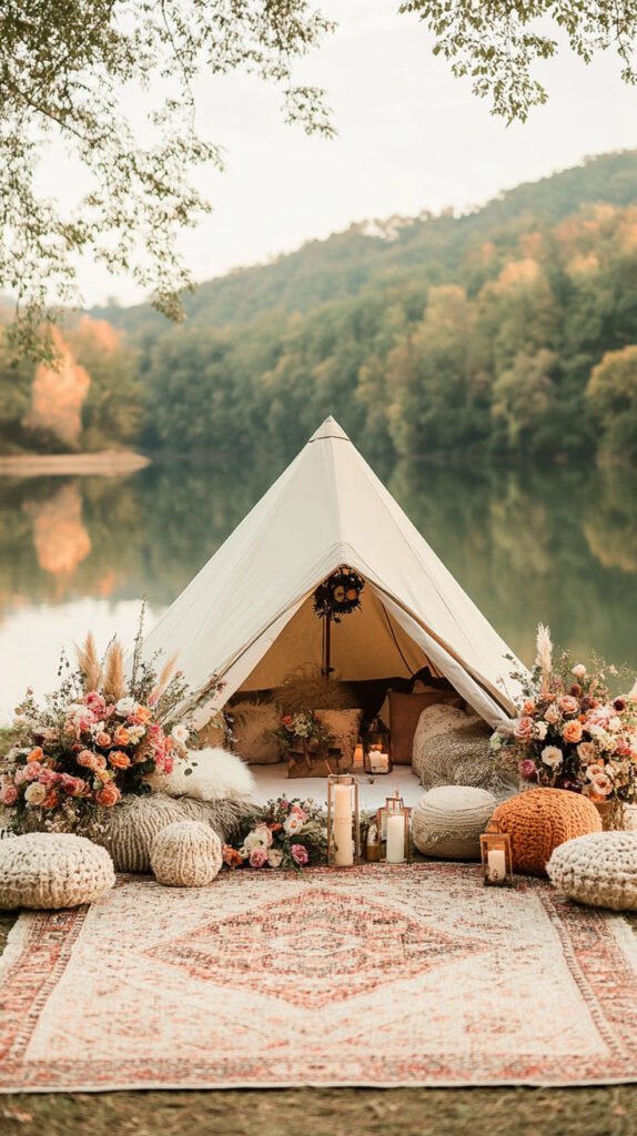 This enchanting glamping setup is truly a sight to behold. A pyramid-style tent is nestled by a calm body of water, its entrance framed by stunning floral arrangements and soft pampas grass. The scene is set for a truly romantic escape.
