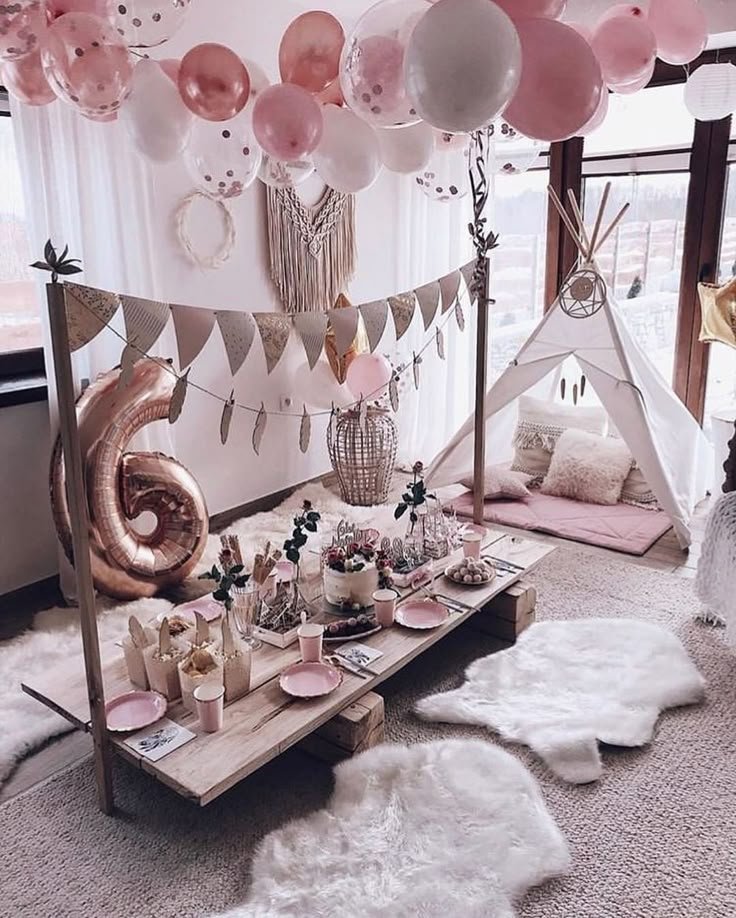 This cozy indoor glamping setup is perfect for a special celebration. A low wooden table is set with pink plates and party treats. A balloon arch in shades of pink and rose gold hangs overhead, creating a festive atmosphere.