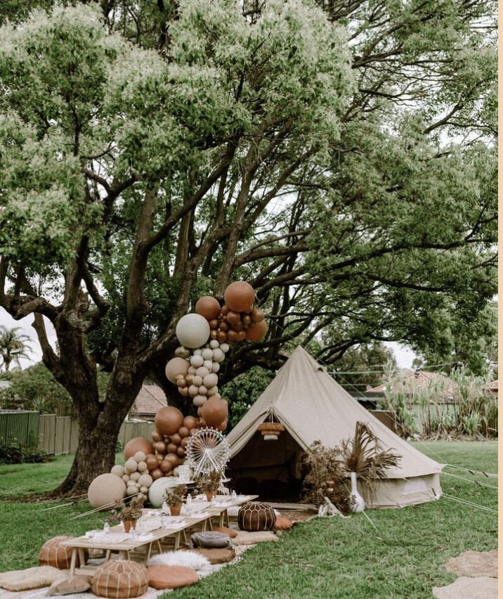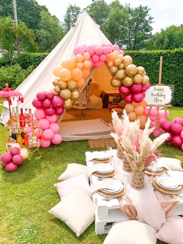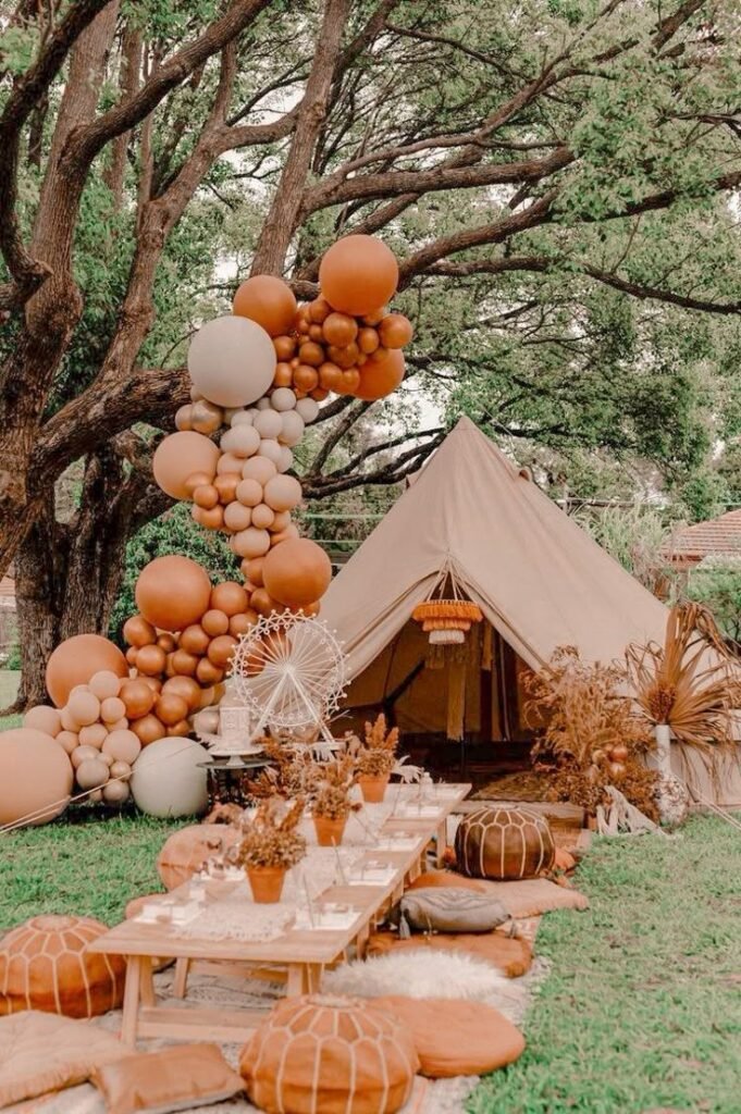 This vibrant setup is ready for a festive party. A playful arch of pink, gold, and peach balloons frames the tent’s entrance. Outside, a low table and cushions create a stylish and intimate picnic area for guests.