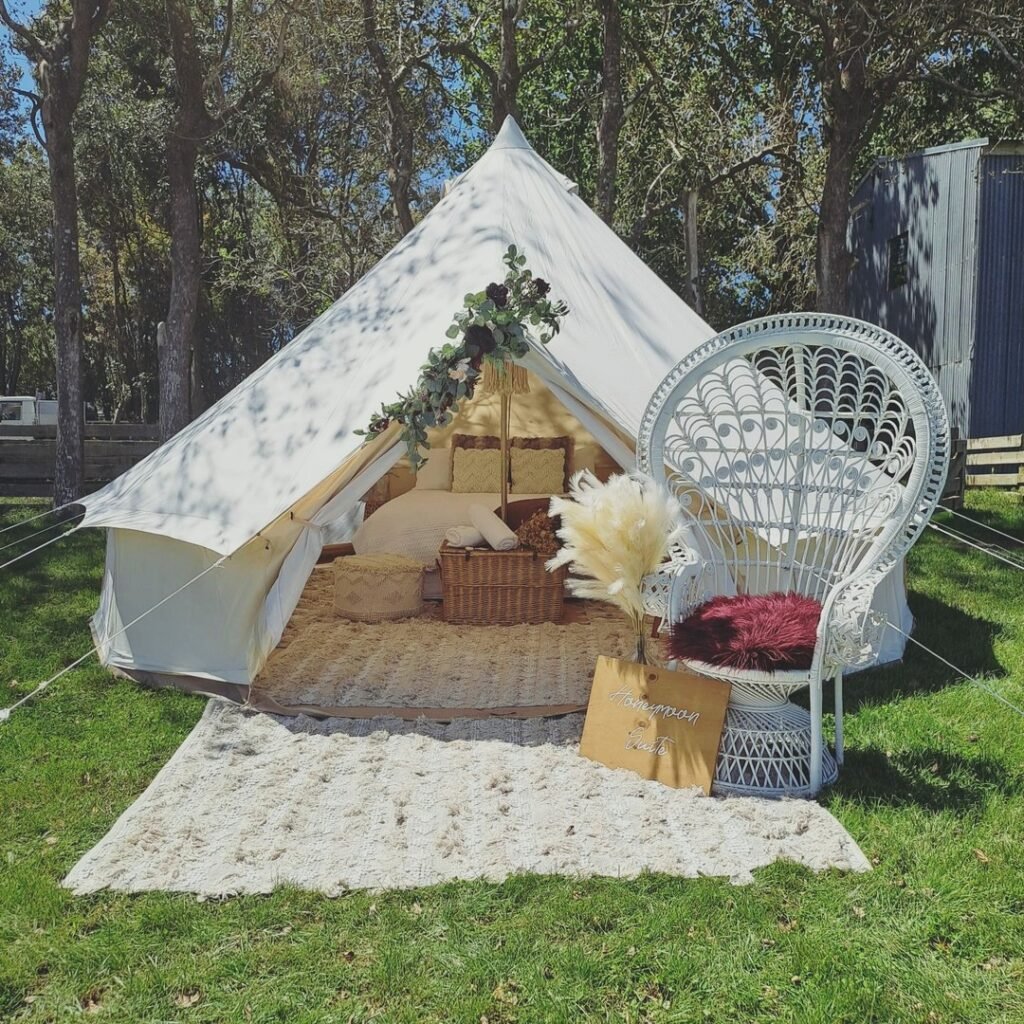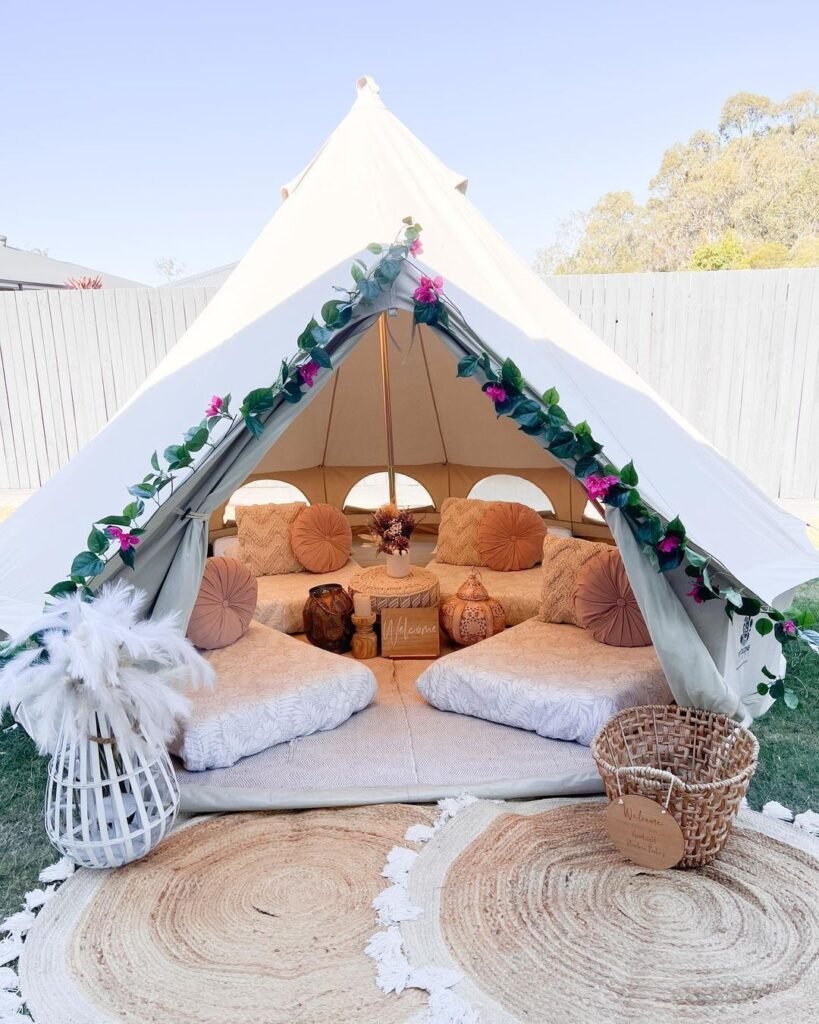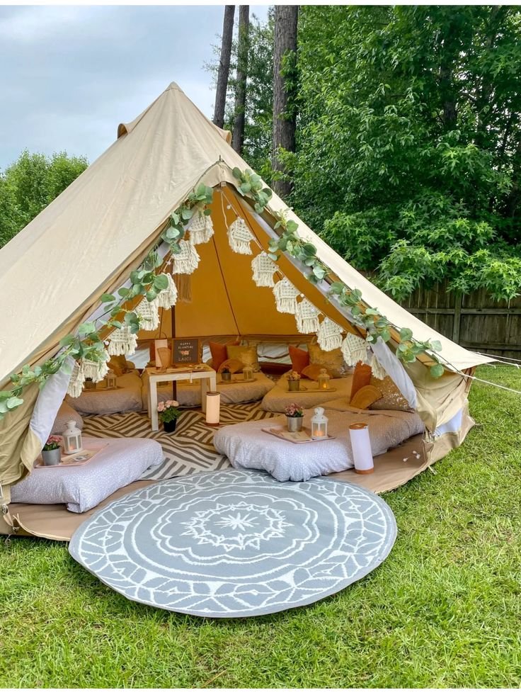 This outdoor glamping set up creates a charming social space. A bell tent is adorned with lovely greenery and decorative macrame hangings. Inside, individual floor mattresses with soft bedding invite guests to relax.