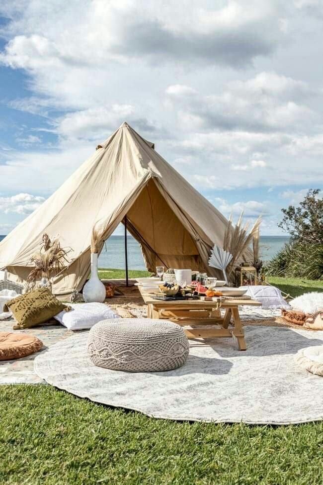 This stylish glamping setup overlooks a stunning ocean view. A large bell tent provides shade and a cozy backdrop for a seaside picnic. The scene is both elegant and perfectly relaxed.
