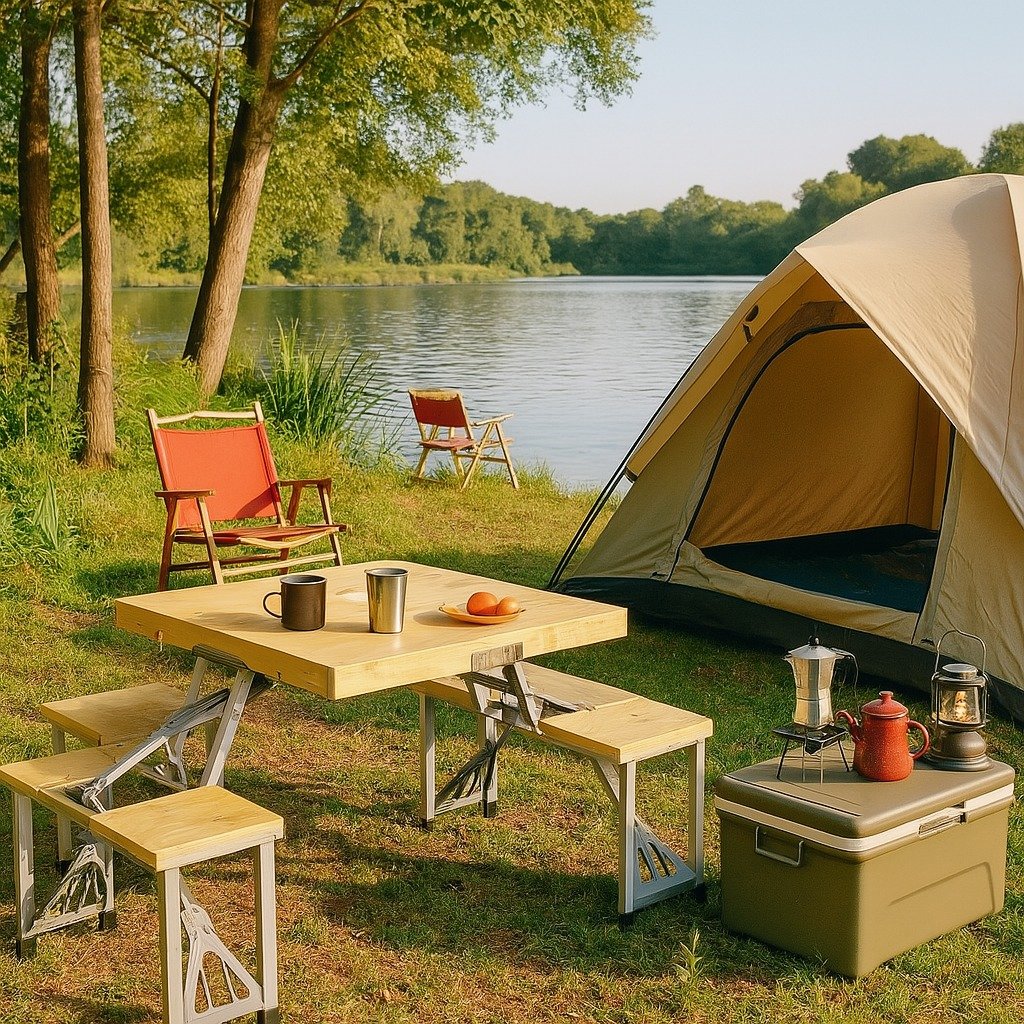 A collapsible wooden table and benches create a functional dining area. Nearby, a cooler and camping stove are ready for a delicious meal. This setup focuses on practicality and easy enjoyment of the outdoors.