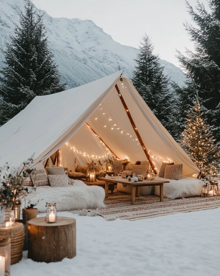 This breathtaking glamping setup is perfect for a winter retreat. A spacious bell tent glows warmly against a snowy mountain backdrop. The entrance is framed by pine trees, one of which is adorned with twinkling lights.