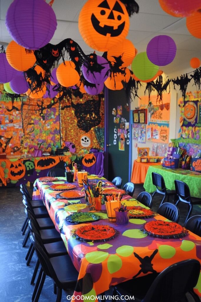 The entire room is transformed with bright, celebratory colors and patterns. The combination of festive ceiling decor and a detailed table setup creates an energetic atmosphere. This is a very joyful and creative way to bring the Halloween theme to life for a birthday party.