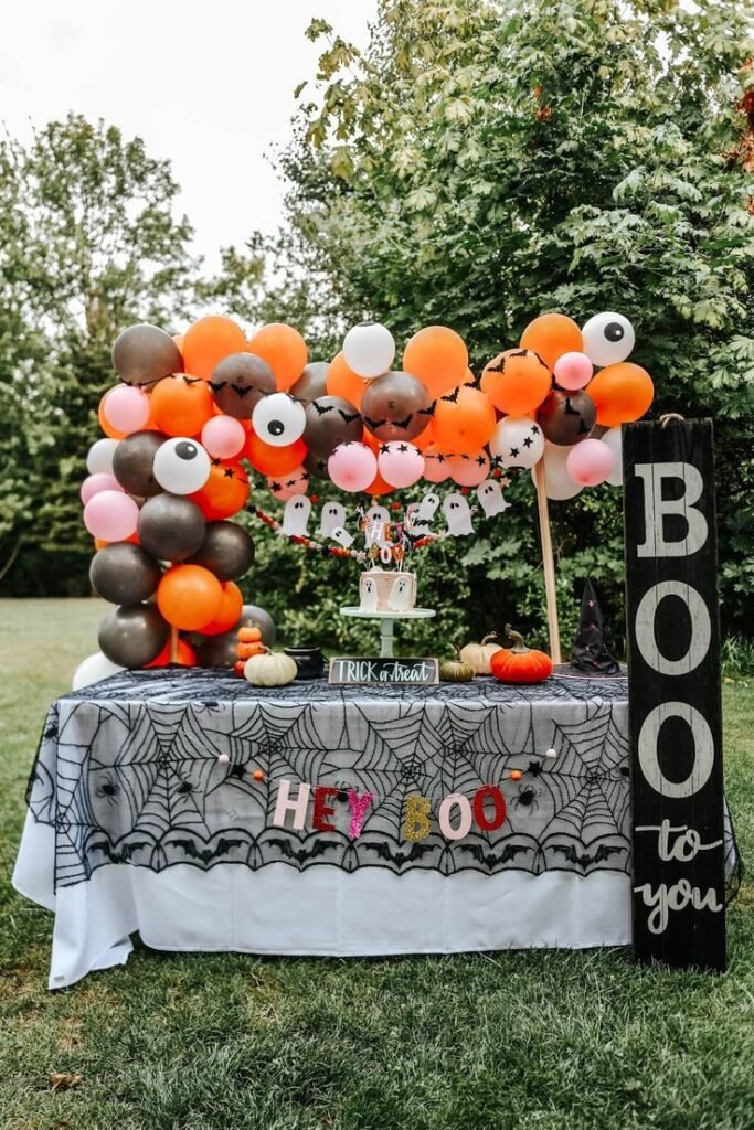 Host a lovely outdoor birthday party with this cute, kid friendly setup. A simple table is covered in a black cobweb print cloth, creating an instant festive feel. A festive balloon garland in muted Halloween shades of orange, black, and white serves as a lovely backdrop for the birthday cake.