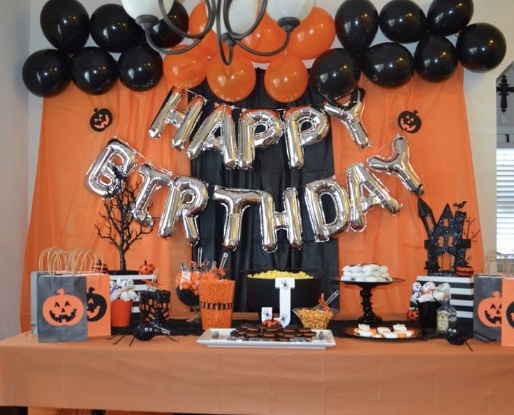 Transform your indoor space with this vibrant and easy to create birthday setup. Silver foil balloons spelling out “Happy Birthday” are the focal point against a backdrop of orange and black fabric. A string of black and orange balloons adds a classic Halloween touch above.