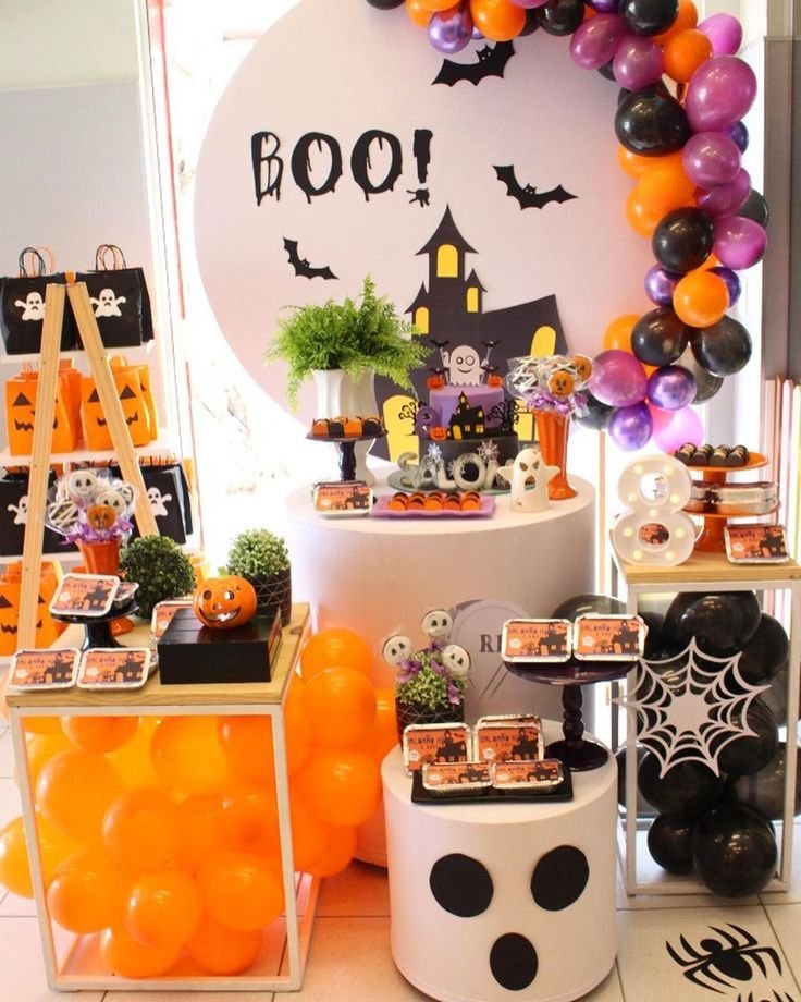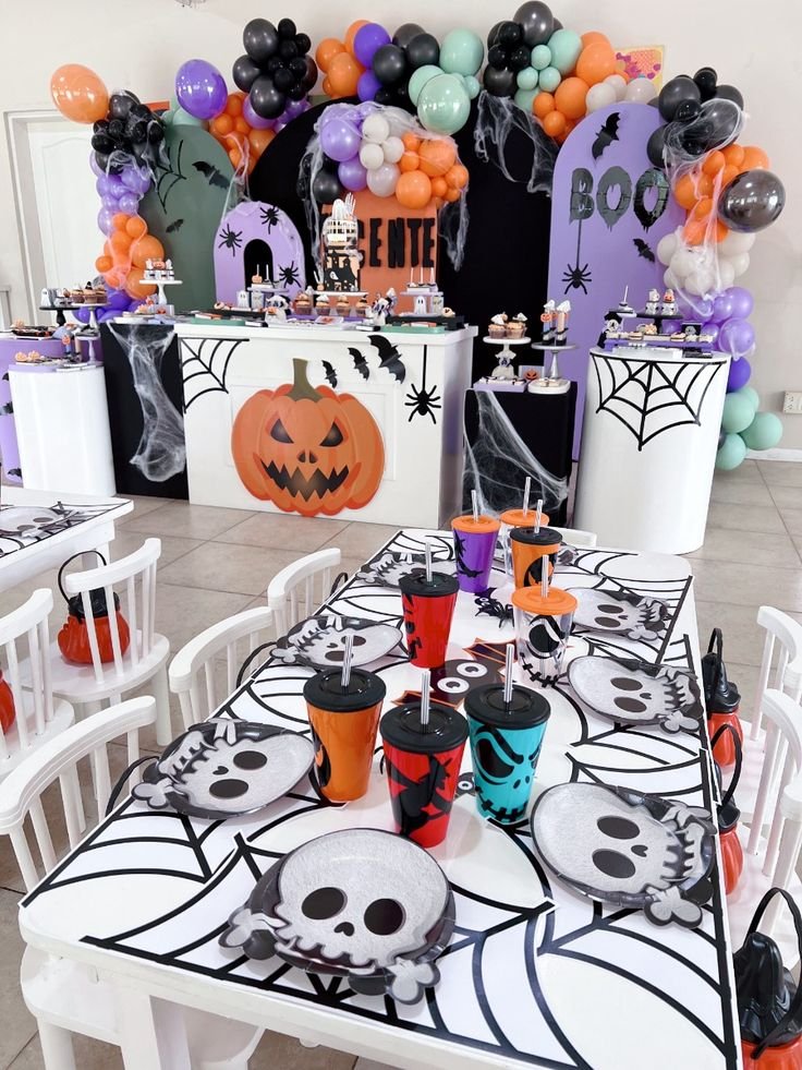 The centerpiece of this setup is a decorated table filled with holiday-themed goodies. A spooky mummy and a grinning pumpkin add a playful atmosphere to the celebration. These simple halloween birthday decorations truly set a memorable scene for your festive event.