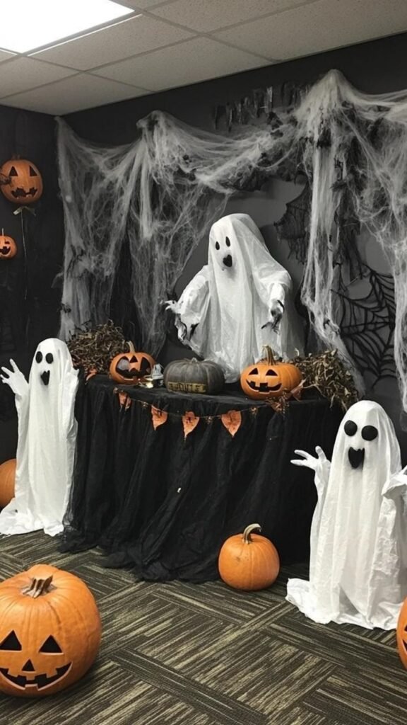 Large pumpkins are scattered across the floor, adding to the festive feeling. The combination of the ghostly figures and the moody lighting creates a truly haunting and fun atmosphere. This scene proves that halloween birthday decorations do not need to be complicated to be incredibly effective.