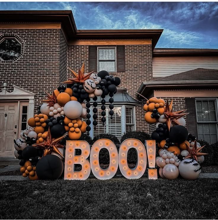 Make a big statement with these light up marquee letters spelling “BOO!” A stunning balloon garland in shades of orange, black, and cream cascades around the letters, creating a show stopping yard display. The large size ensures everyone in the neighborhood will notice this fun setup.