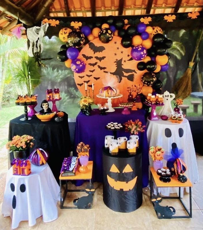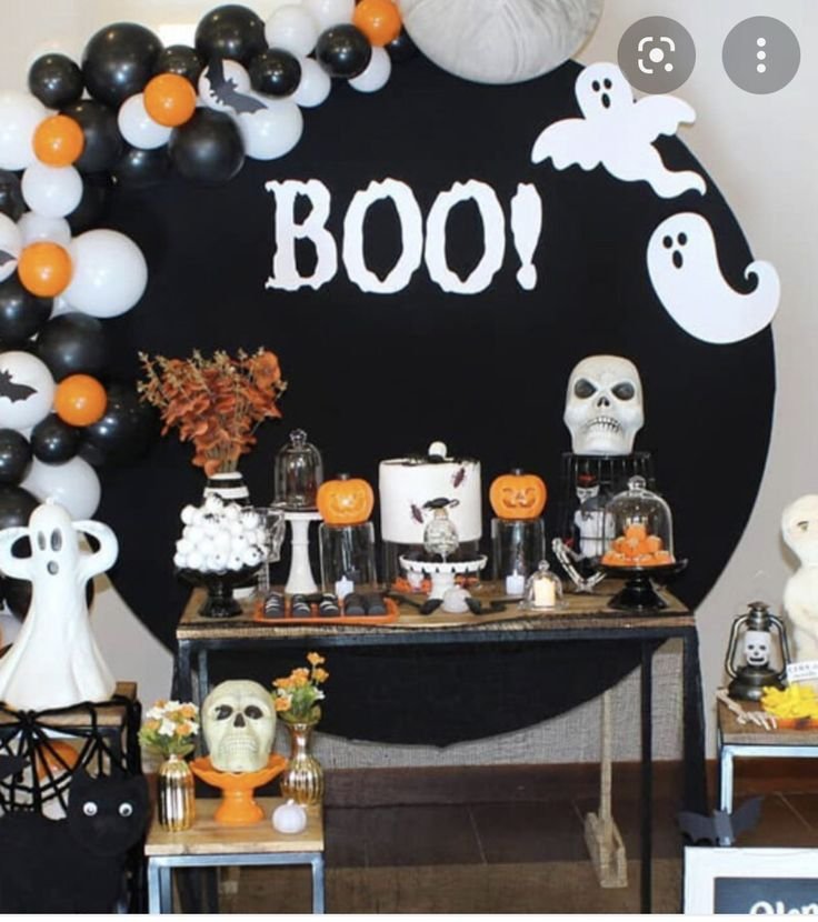 The table itself is filled with an assortment of spooky treats and decorations. A white cake with bat details and jack o lantern cutouts on cake stands make for a festive display. Skull heads and ghost figurines add to the eerie charm. This showcases creative halloween birthday decorations.