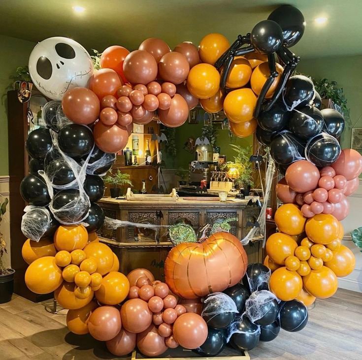 Create a memorable entrance with this intricate and well designed balloon arch. It features a festive color palette of black, orange, and brown balloons, some draped with artificial cobwebs for a spooky feel. A large, stylized Jack Skellington balloon from “The Nightmare Before Christmas” adds a unique theme.