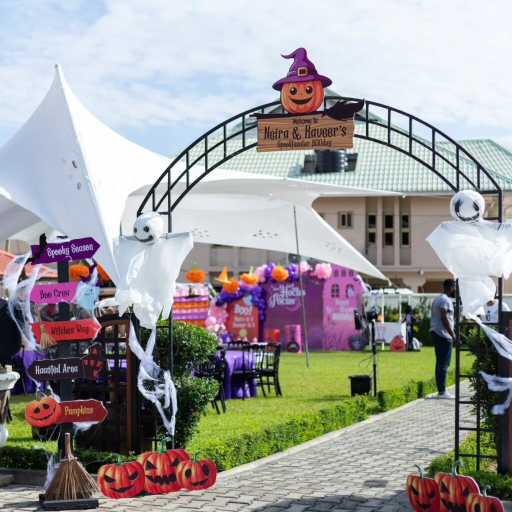 Greet your partygoers with this enchanting entrance, setting the stage for a fun-filled event. A charming sign welcomes guests to a “Spooktacular Birthday,” complete with a friendly pumpkin wearing a witch’s hat. This archway draped with ghostly figures and cobwebs offers a delightful first impression.