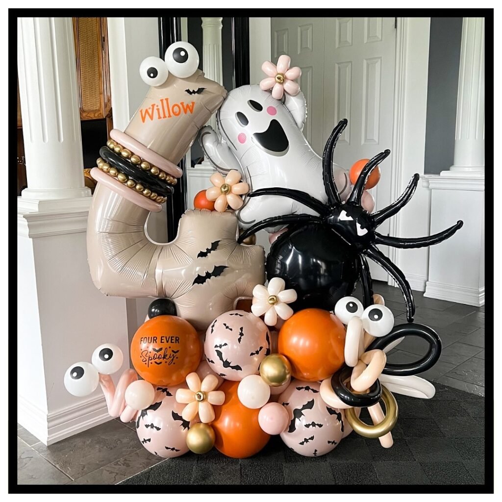 The balloon clusters include unique elements, like starburst balloons and smaller pumpkin shaped balloons, adding great texture and dimension. It’s a modern and striking way to announce a celebration to all passersby. This is a very creative take on halloween birthday decorations.