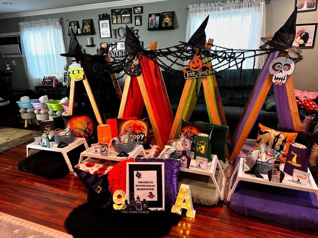 Host a memorable sleepover with these charming indoor tents, a fantastic idea for any spooky celebration. Each tent features a witch’s hat on top and is strung together with fake spiderwebs, creating a cozy and haunted feel. The setup is perfect for halloween birthday decorations.