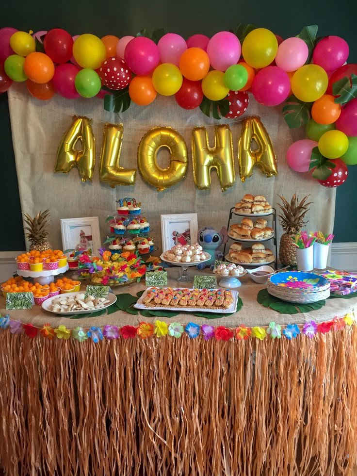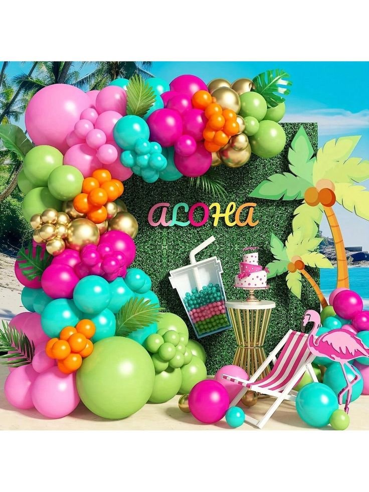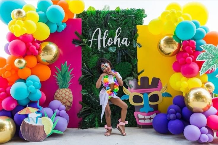 Colorful beach balls and paper confetti scatter around the display. Pink “ALOHA” balloons add a striking backdrop. These elements combine to form a truly festive and inviting scene.