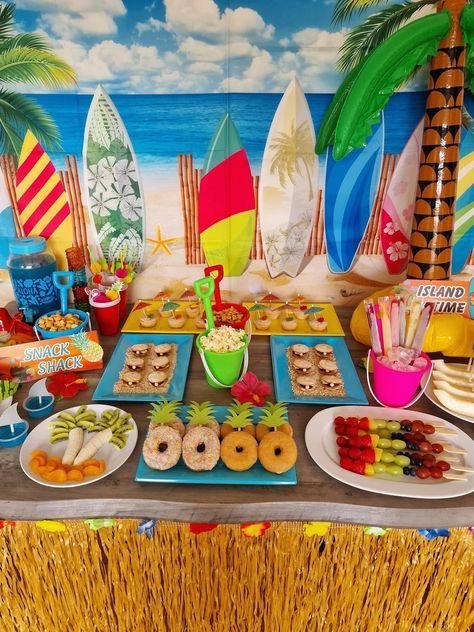 Set up a fun Beach Snack Shack, an amazing idea for Hawaiian theme party ideas focused on treats. The table features colorful tropical fruit skewers and pineapple-shaped donuts. It creates a playful and delicious display.