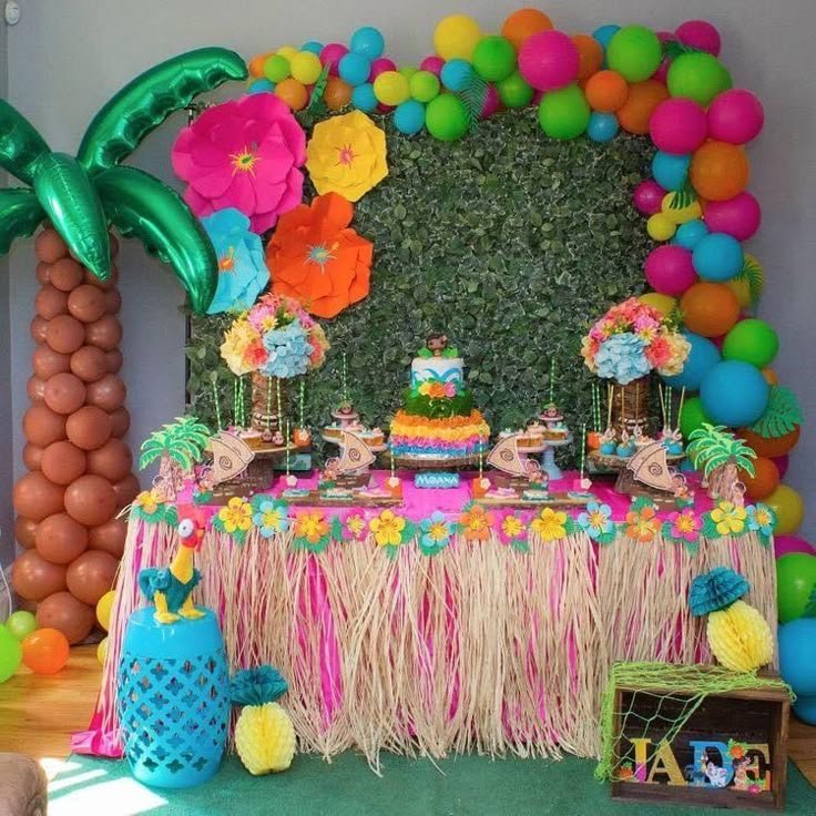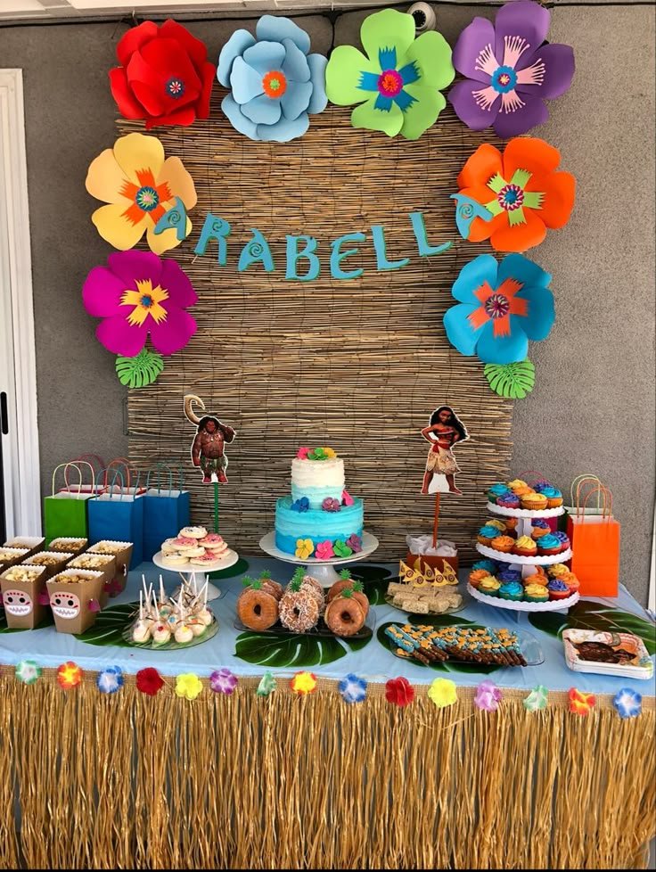 Set up a fantastic Moana Dessert Bar, a cheerful and fun option among your Hawaiian theme party ideas. The straw mat backdrop and grass table skirt feel perfectly authentic. It creates a great spot for all the party treats.