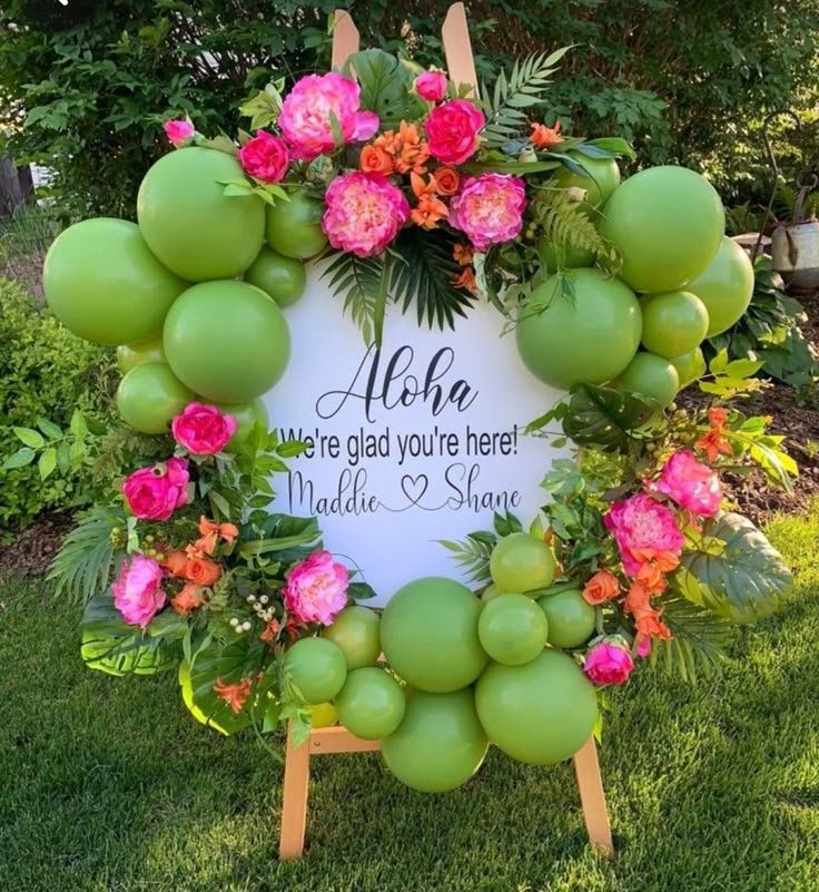 A lush wreath of bright green balloons and vivid flowers frames the message beautifully. Hot pink peonies and orange tropical blooms add amazing color. This arrangement creates a gorgeous focal point.