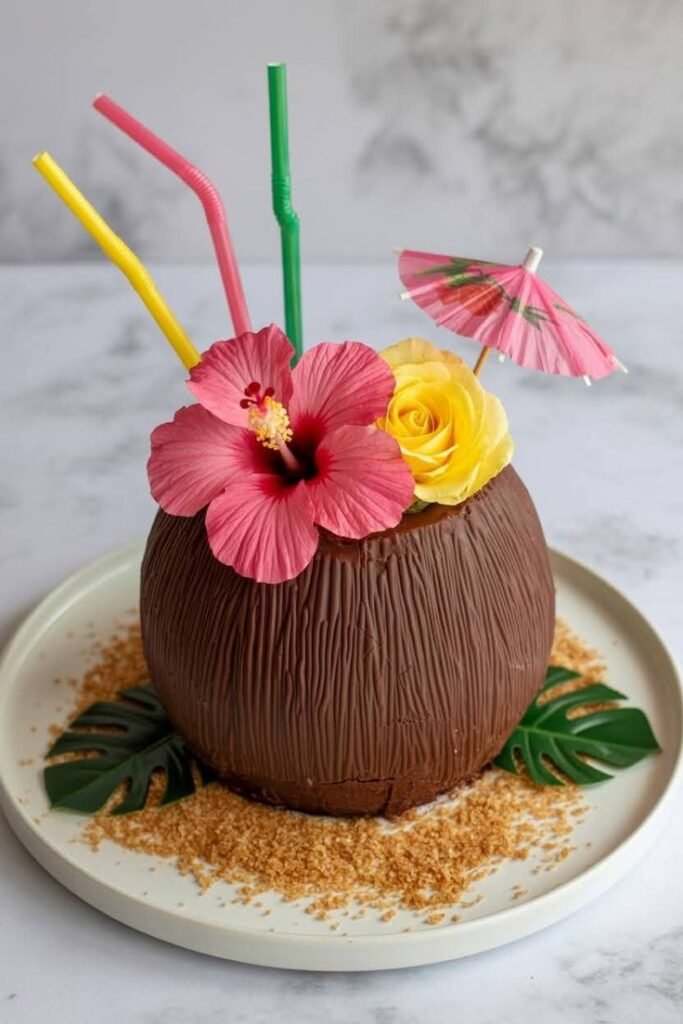 Serve this incredibly creative Coconut Cake for a sweet twist on Hawaiian theme party ideas. The chocolate coating mimics the husk texture beautifully. It looks just like a giant tropical drink.