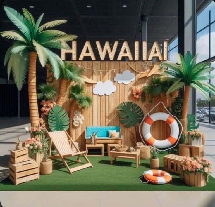A wooden slatted wall acts as a charming backdrop, adorned with tropical leaves and string lights. Cardboard palm trees frame the scene, enhancing the vacation vibe. The “HAWAIIAN” sign adds a clear theme statement.