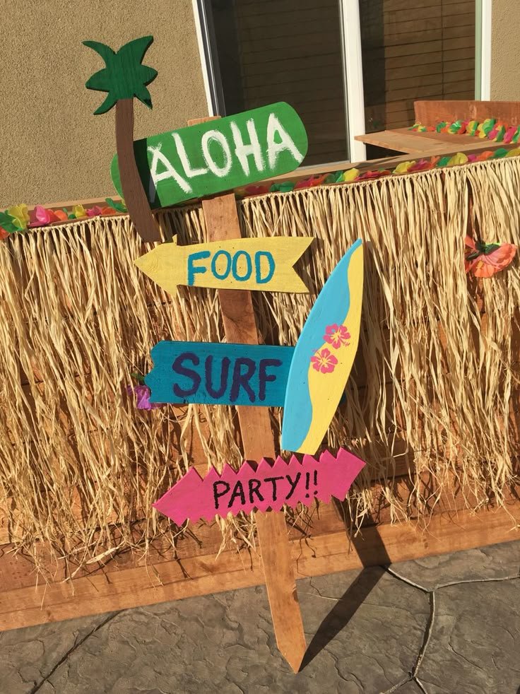 The sign is set against a raffia table skirt, instantly establishing a luau feel. Bright colors like sunny yellow, surf blue, and hot pink stand out. This clever prop looks handmade and charming.