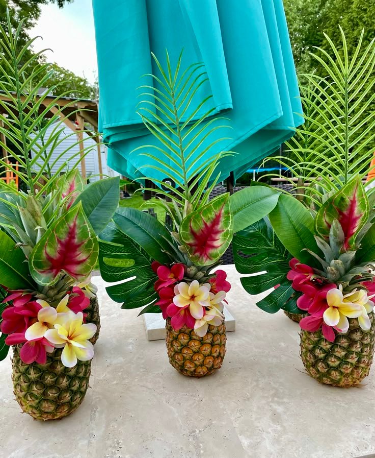 Create stunning tabletops with these gorgeous Pineapple Centerpieces, a simple yet elegant choice for Hawaiian theme party ideas. The natural pineapple forms a unique, rustic vase. They add authentic tropical charm to every table.
