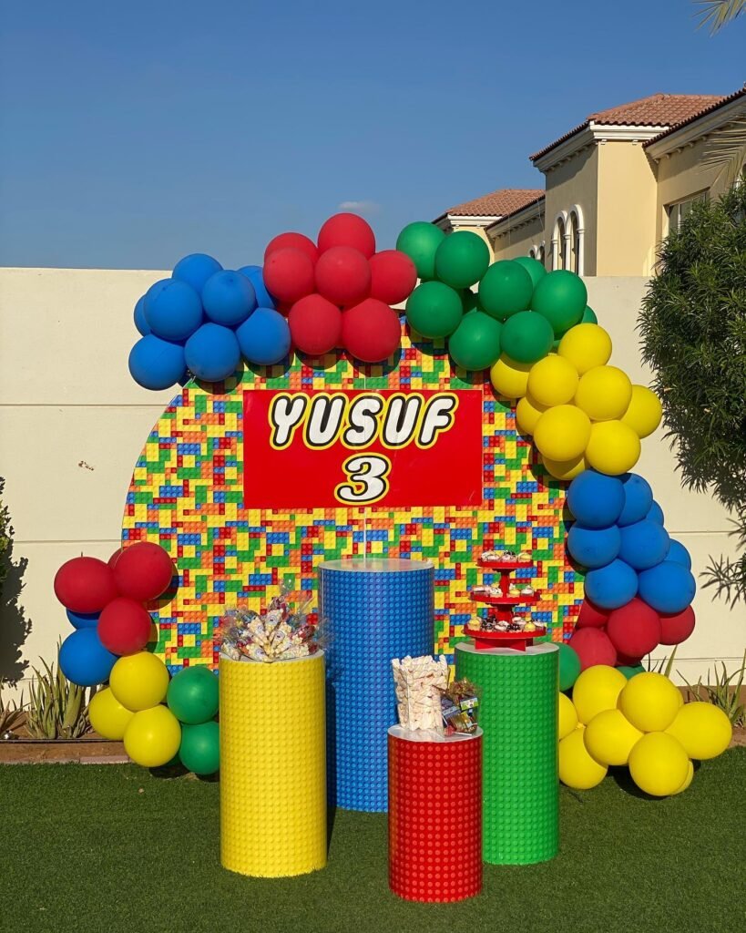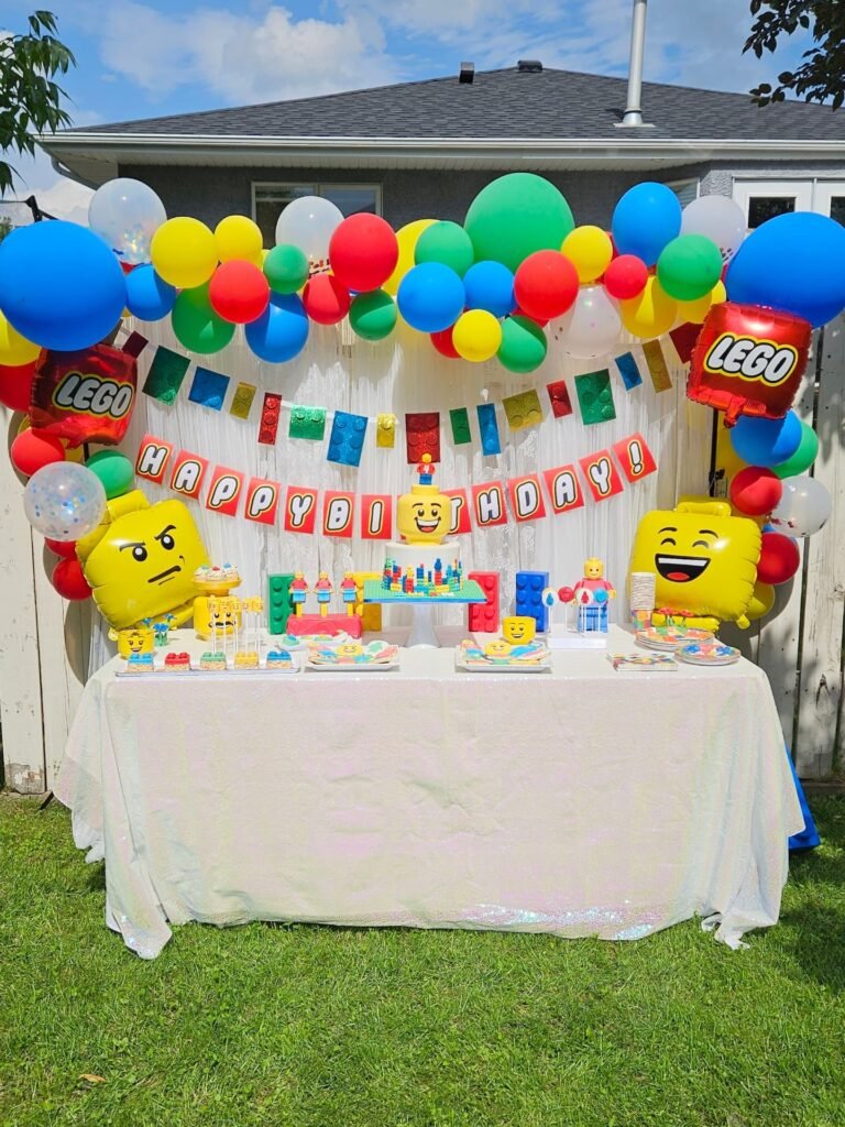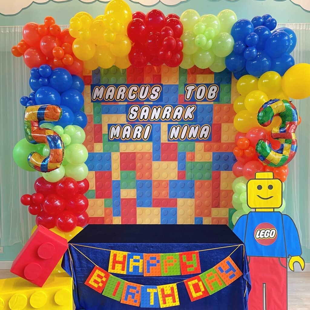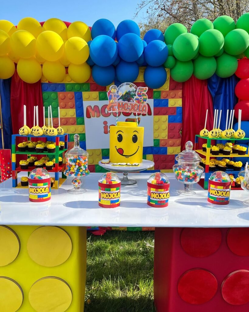 A colorful balloon garland and a personalized brick backdrop complete the vibrant scene. It’s a fantastic lego birthday party display that will make every guest feel happy.