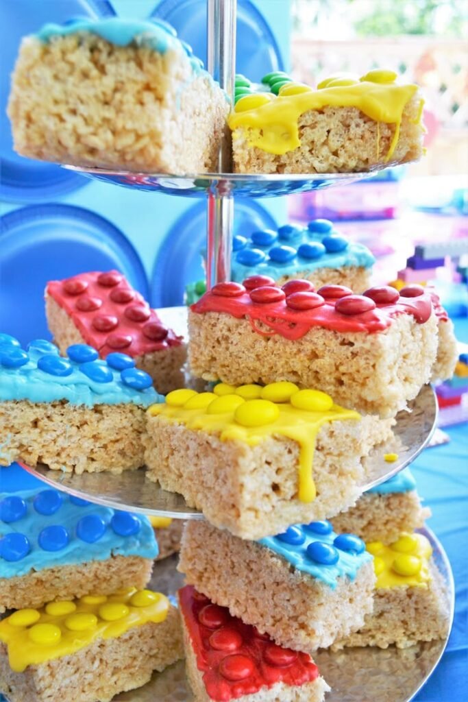 These delicious rice crispy treats are a fun and easy addition to any lego birthday party. Each square is topped with a colorful candy melt and small, round candies that look just like the iconic building block studs.