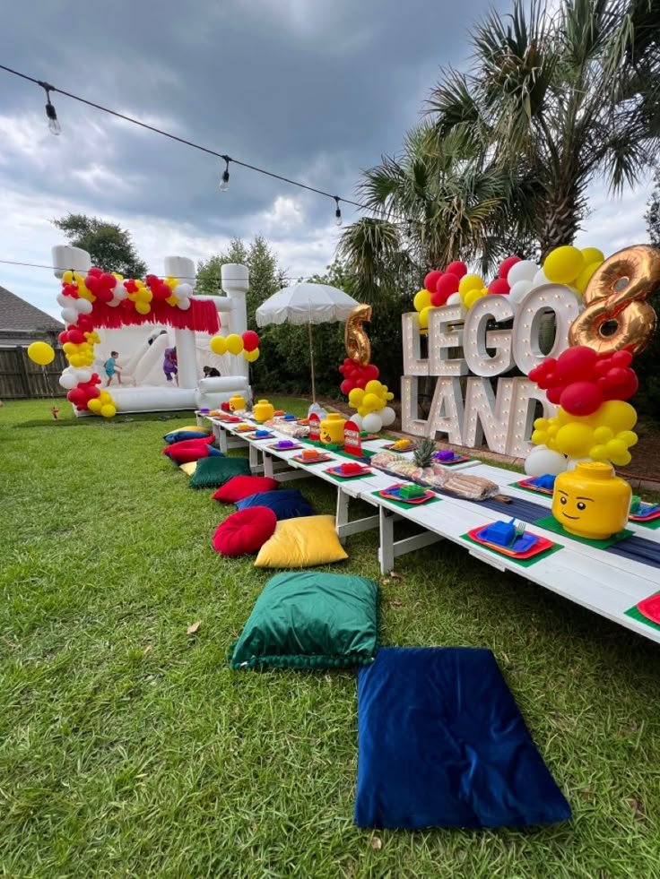 This outdoor party is a lego birthday party dream come true. A long, low table is set for guests to sit on colorful cushions. An impressive ‘LEGOLAND’ sign with light-up letters creates a magical atmosphere.